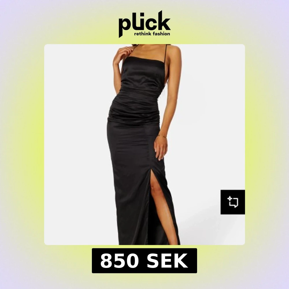 Snygg svart långklänning i satin med smala axelband, slits framtill och öppen rygg med snörningsdetalj. Säljer klänningen eftersom den bara är använd en gång, när jag hade bal. Den är som ny.