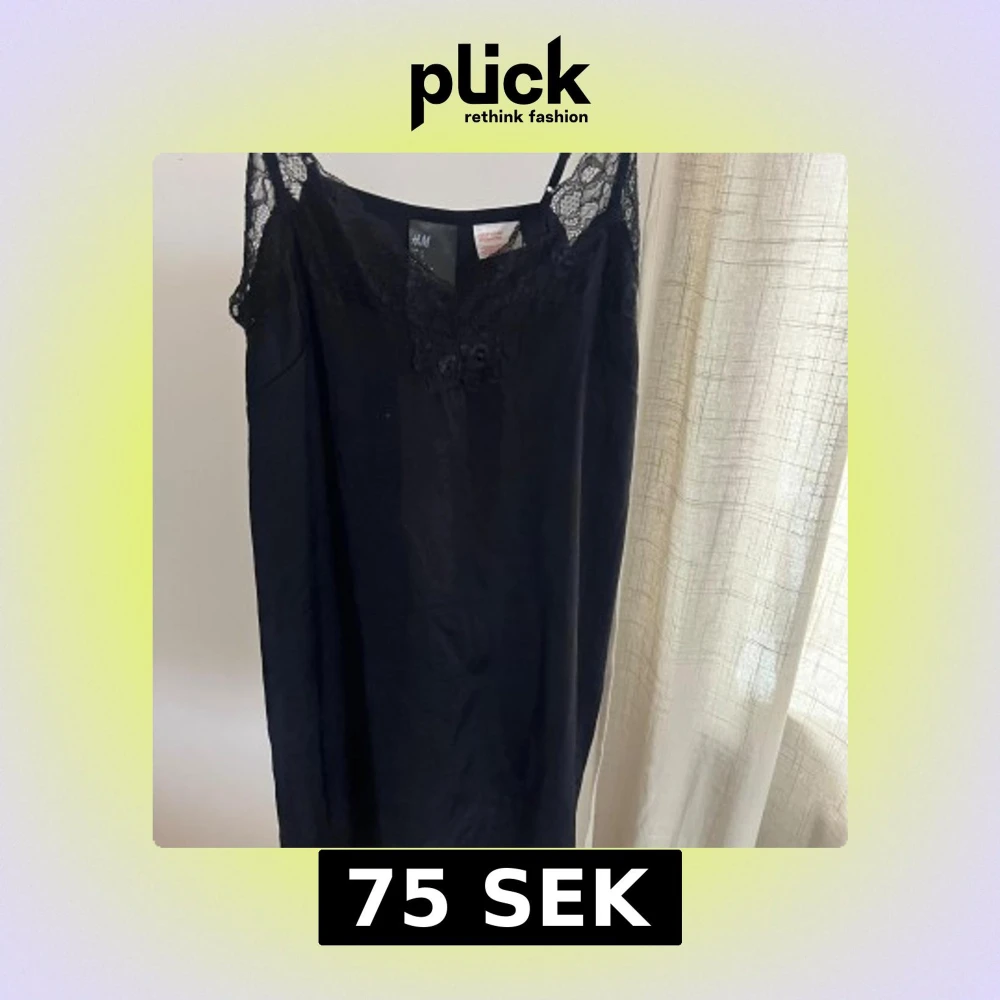 Svart klänning från H&M med tunna axelband och vacker spetsdetalj vid halsringningen. Klänningen har en rak och enkel siluett som ger en stilren look. Perfekt för dig som gillar minimalistisk stil med en touch av spets.