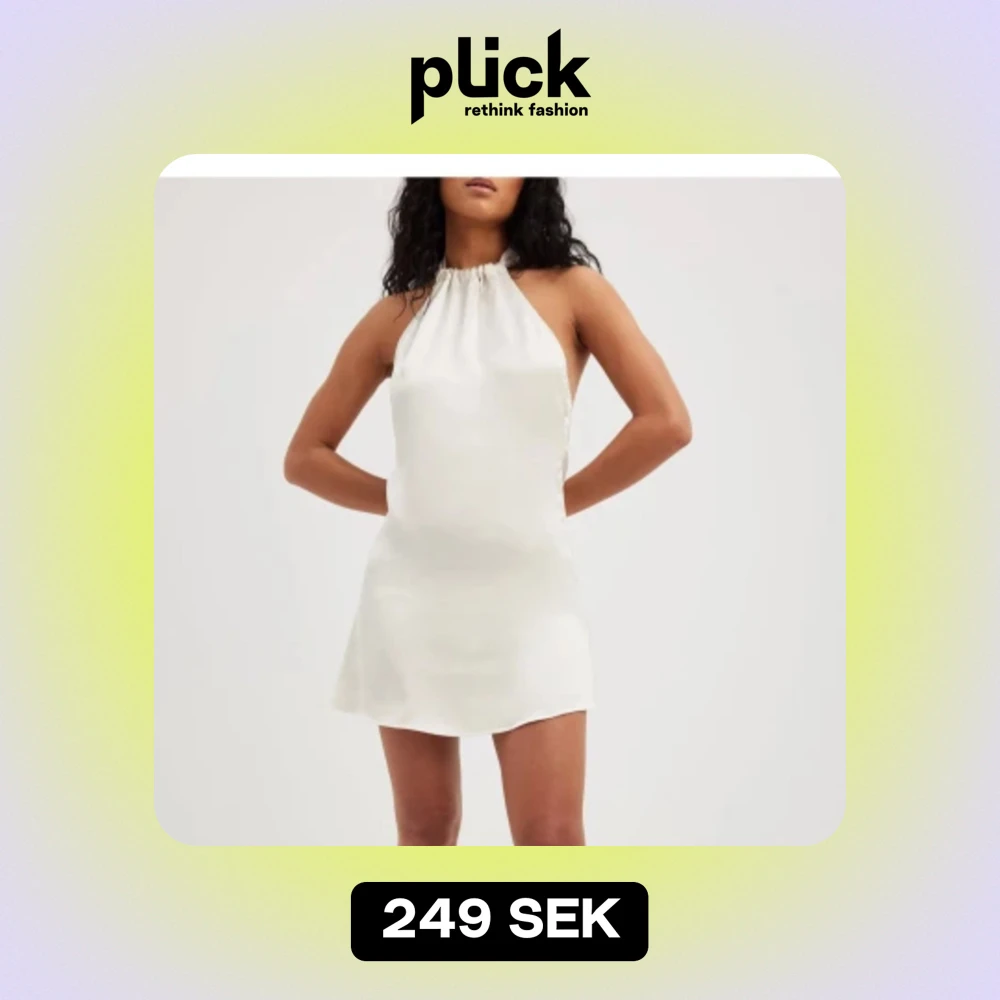 Den här miniklänningen har ett satintyg. Den har en halterneckdesign med en knytbar stängning. Den här miniklänningen kommer i naturvitt.