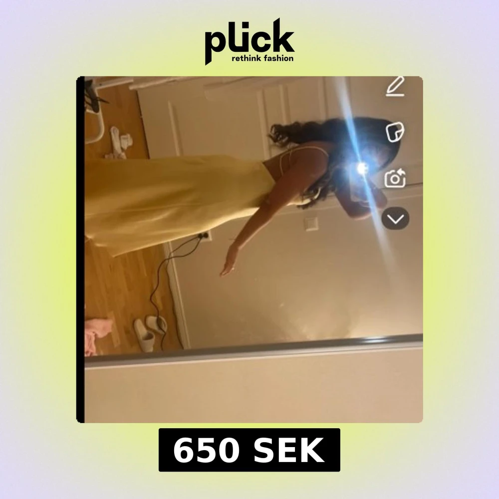 Säljer en ljusgul långklänning i satin med smala axelband och öppen rygg med flera banddetaljer. Klänningen har en elegant v-ringning och ett mjukt, glansigt material som faller snyggt. Perfekt för sommarens speciella tillfällen. Slutsåld o är i strkl S