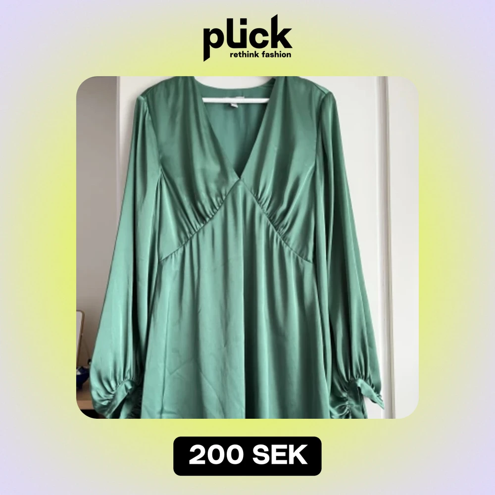 Smaragdgrön satinklänning med stora ballongärmar. Klänningen är ganska kort, typ mitt på låret på mig som är knappt 170 cm lång. Väldigt vackert fall! Använd en gång.