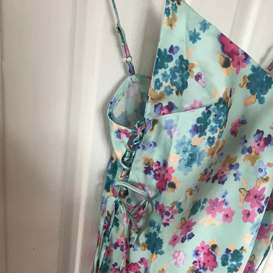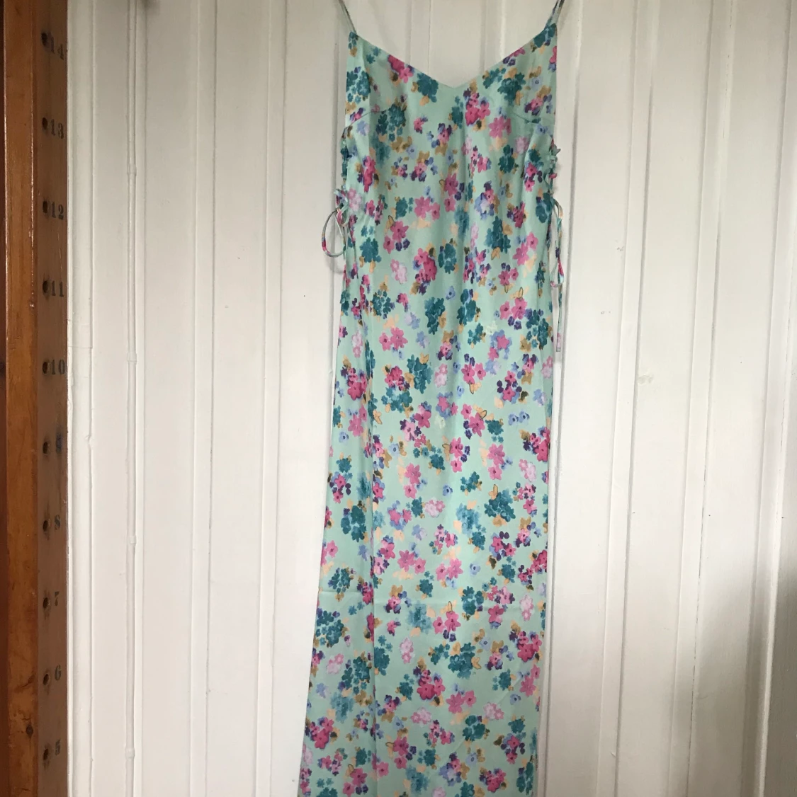 Turkos/ljusblå satinklänning med blommor, snörning i sidan så man kan justera storleken lite och justerbara axelband✨ helt ny och aldrig använd, perfekt till sommaren!!!💕