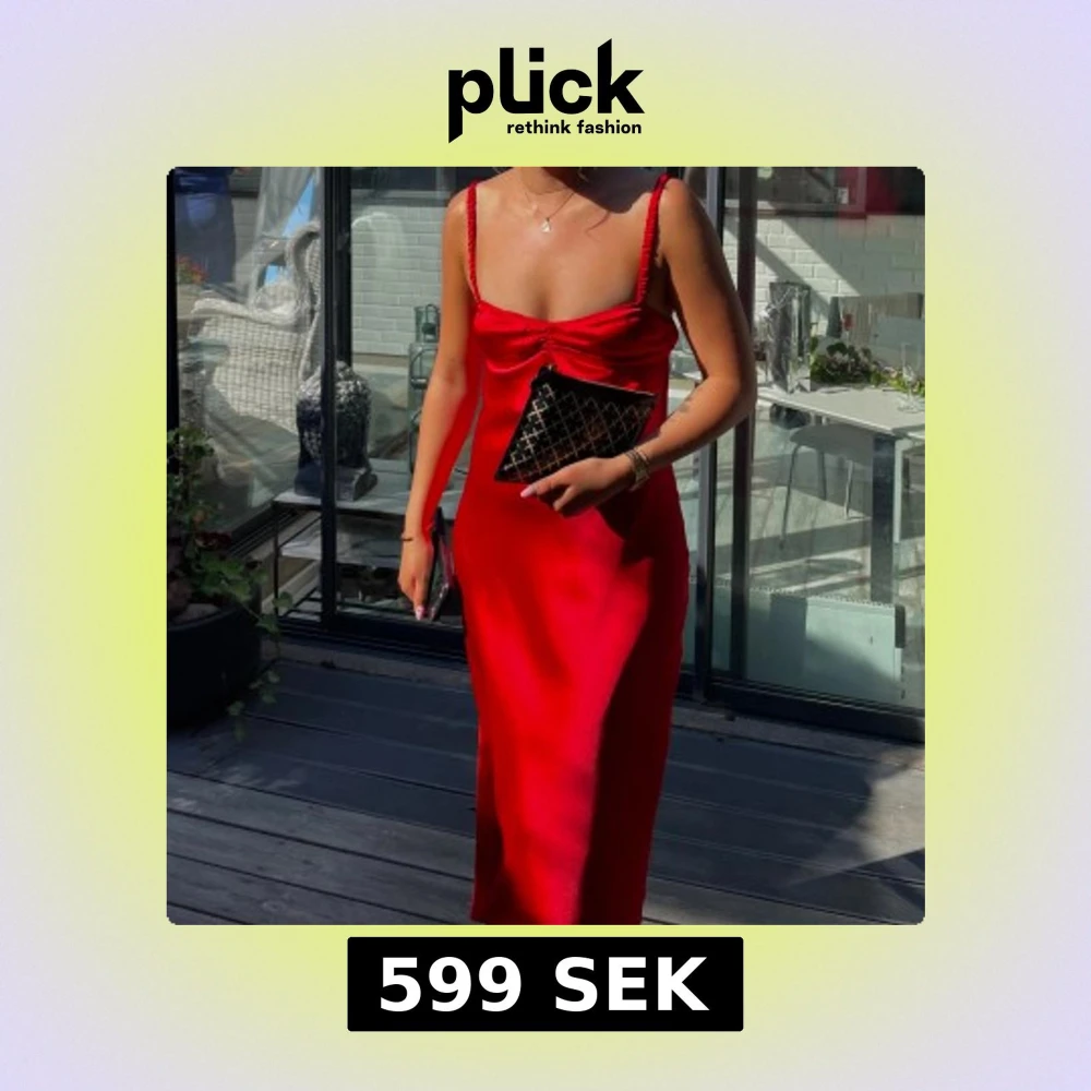 Säljer en röd långklänning i satin med smala axelband och snygg rynkdetalj vid bysten. Klänningen har en figurnära passform och öppen rygg. Använd en gång så mycket fint skick. Jag är 164 och klänningen går till mina anklar❤️