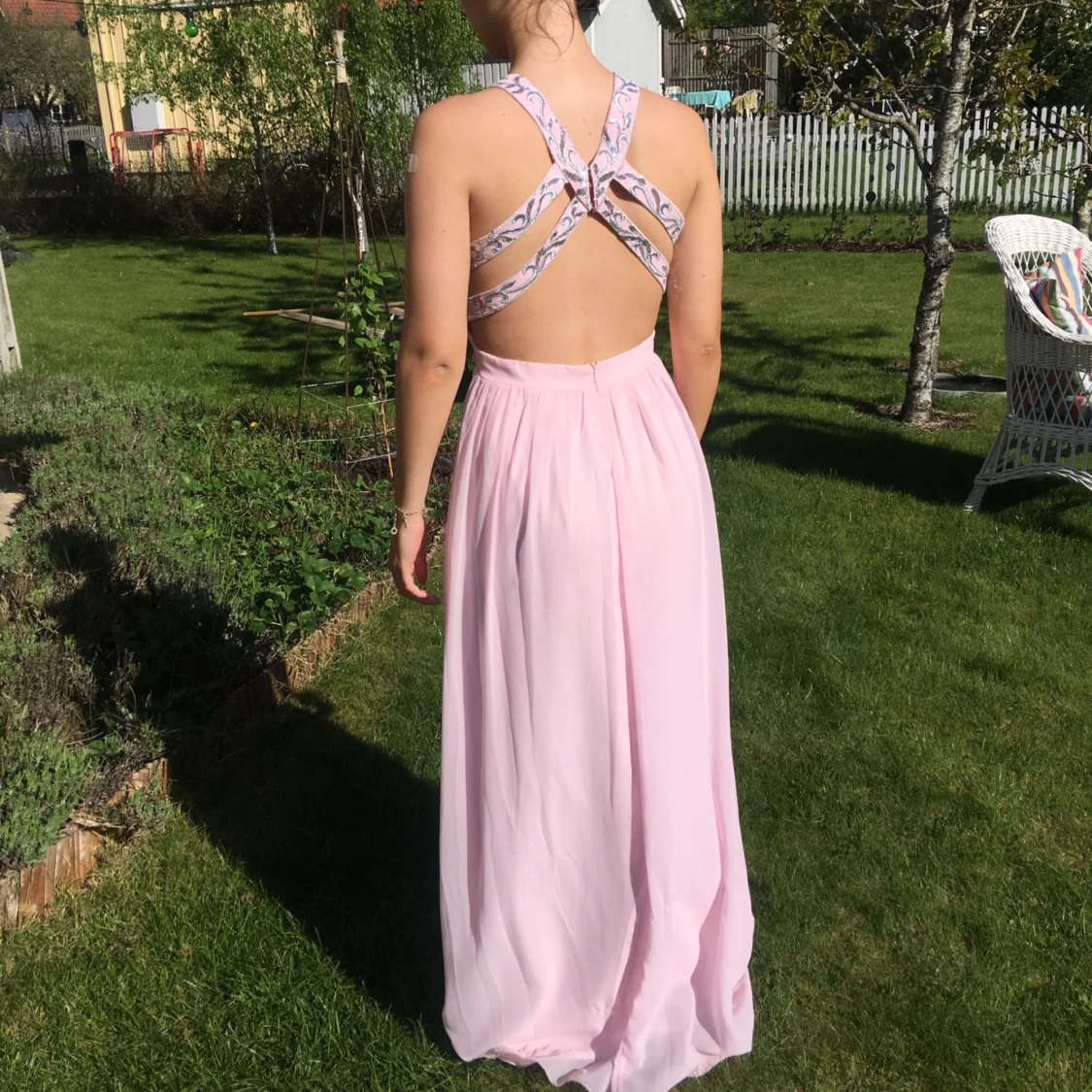 Köptes för 1300kr. Använd en gång och är i bra skick! (Inga missfärgningar eller slitningar). Jag är 1.63 lång klänningen passar perfekt för mig med ett par klackar eller högre sneakers. Frakten är gratis