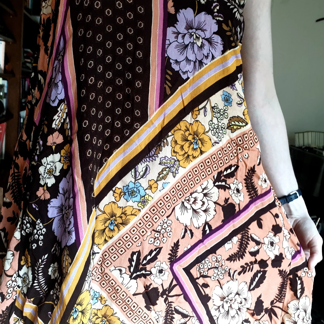Luftig kort klänning i ett rikt färgglatt mönster. Asymmetrisk, längre i mitten både framtill och bak.