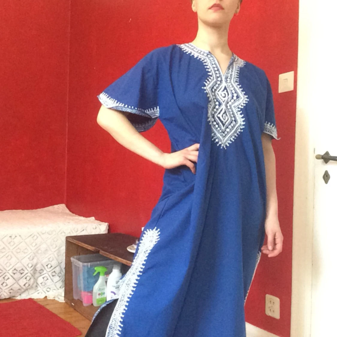A beatiful blue dress with unfortunately unknown origins, since I have owned it for years and years. Detailed white patterns. Frakt +50kr