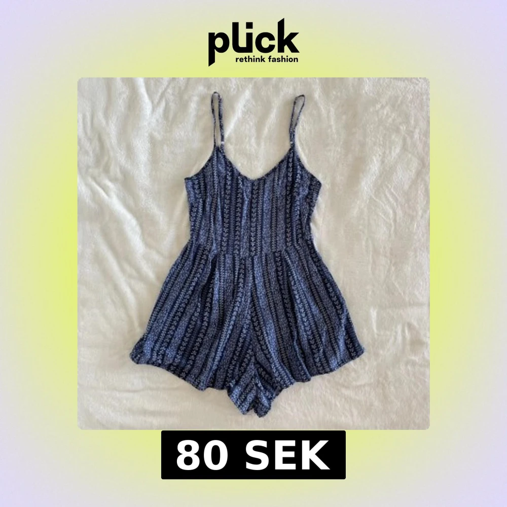 Supersöt blå playsuit med smala axelband och v-ringning. Playsuiten har ett diskret blommigt mönster i vitt och blått, samt en luftig passform som är perfekt för varma dagar.