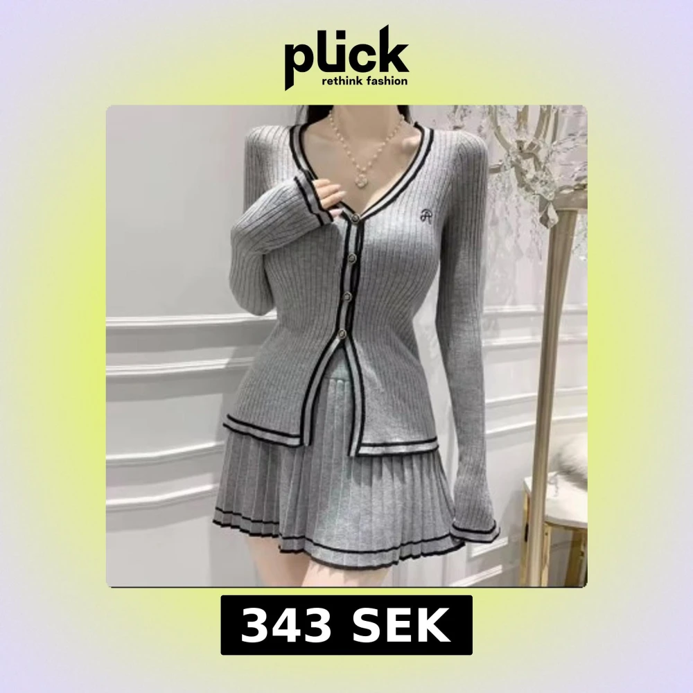 Set kofta Knitted Grå ribbad med knappar och kjol