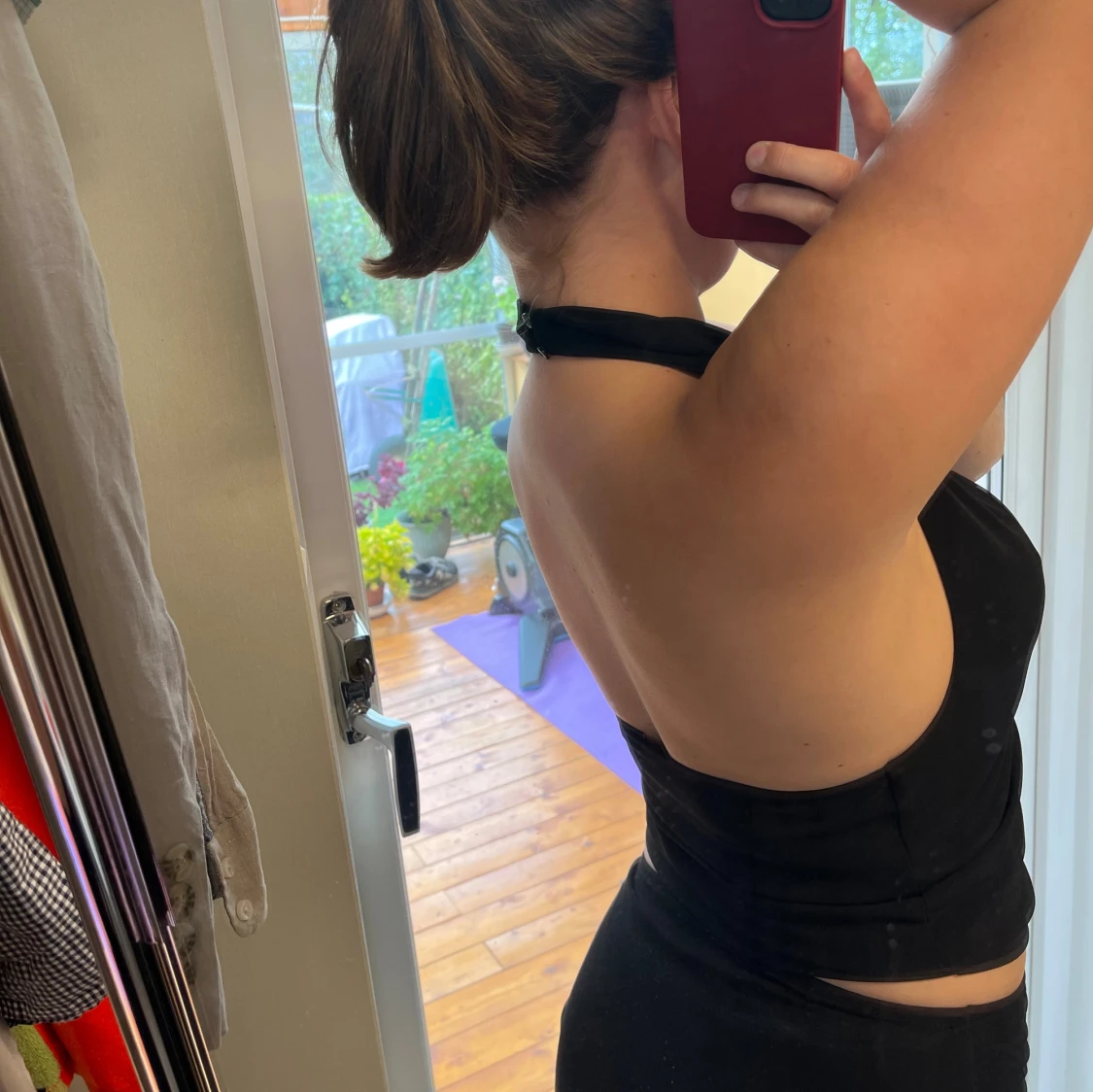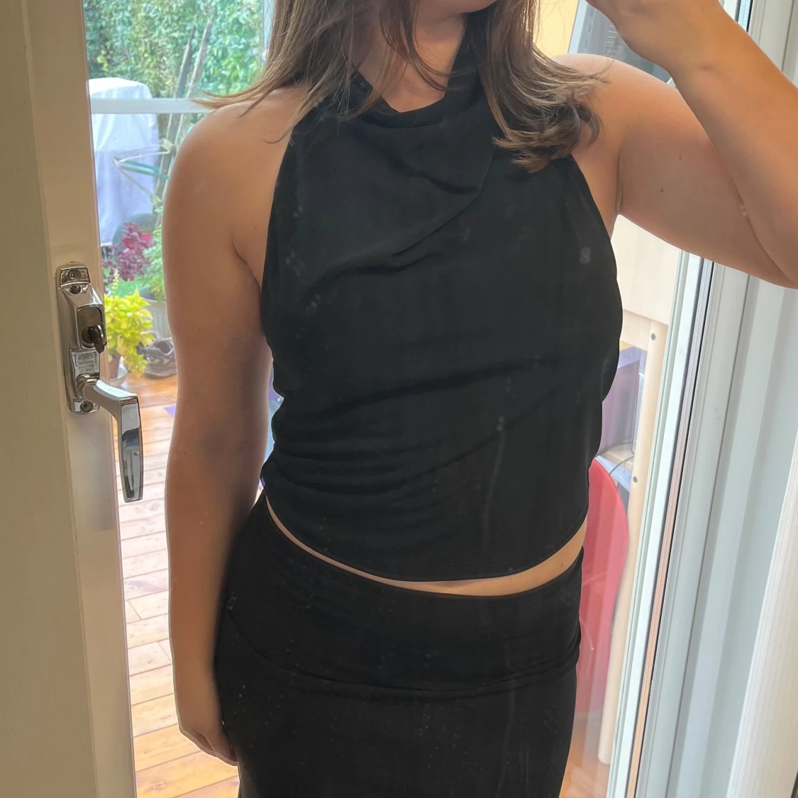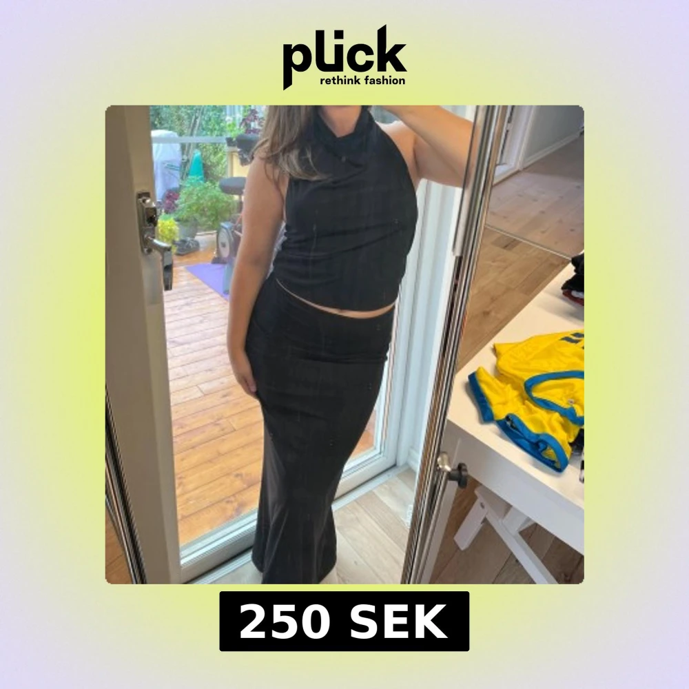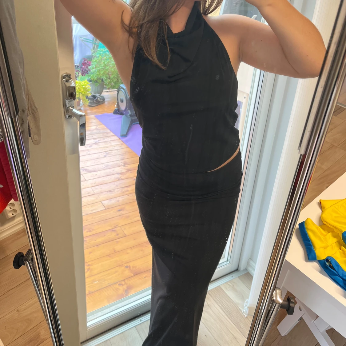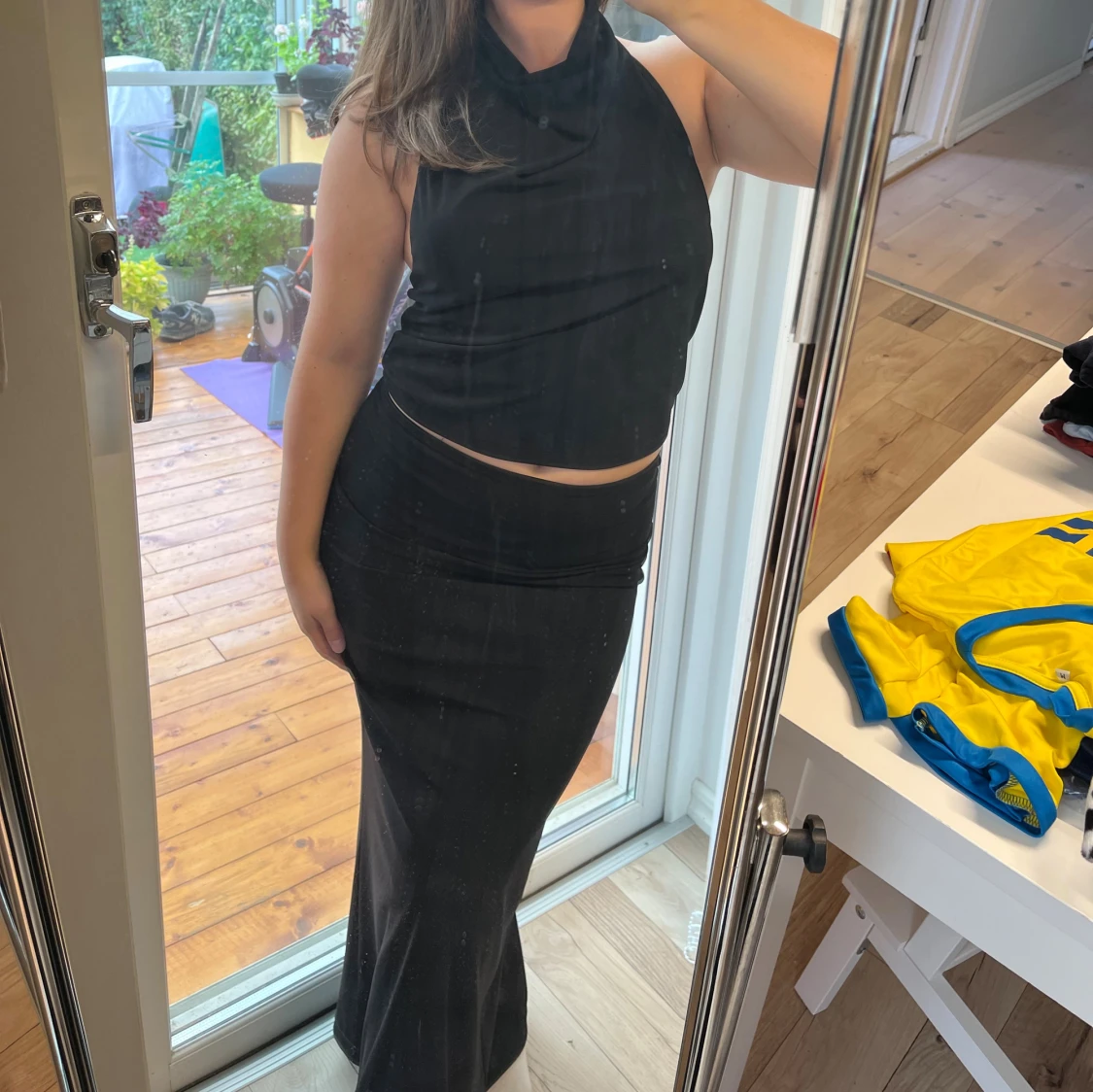Såå snyggt set med kjol och en halterneck topp med öppen rygg. Passar jättebra till fest! Bra skick endast några trådar som gått upp i sömnen längst ner på kjolen men inget som inte går att fixa.