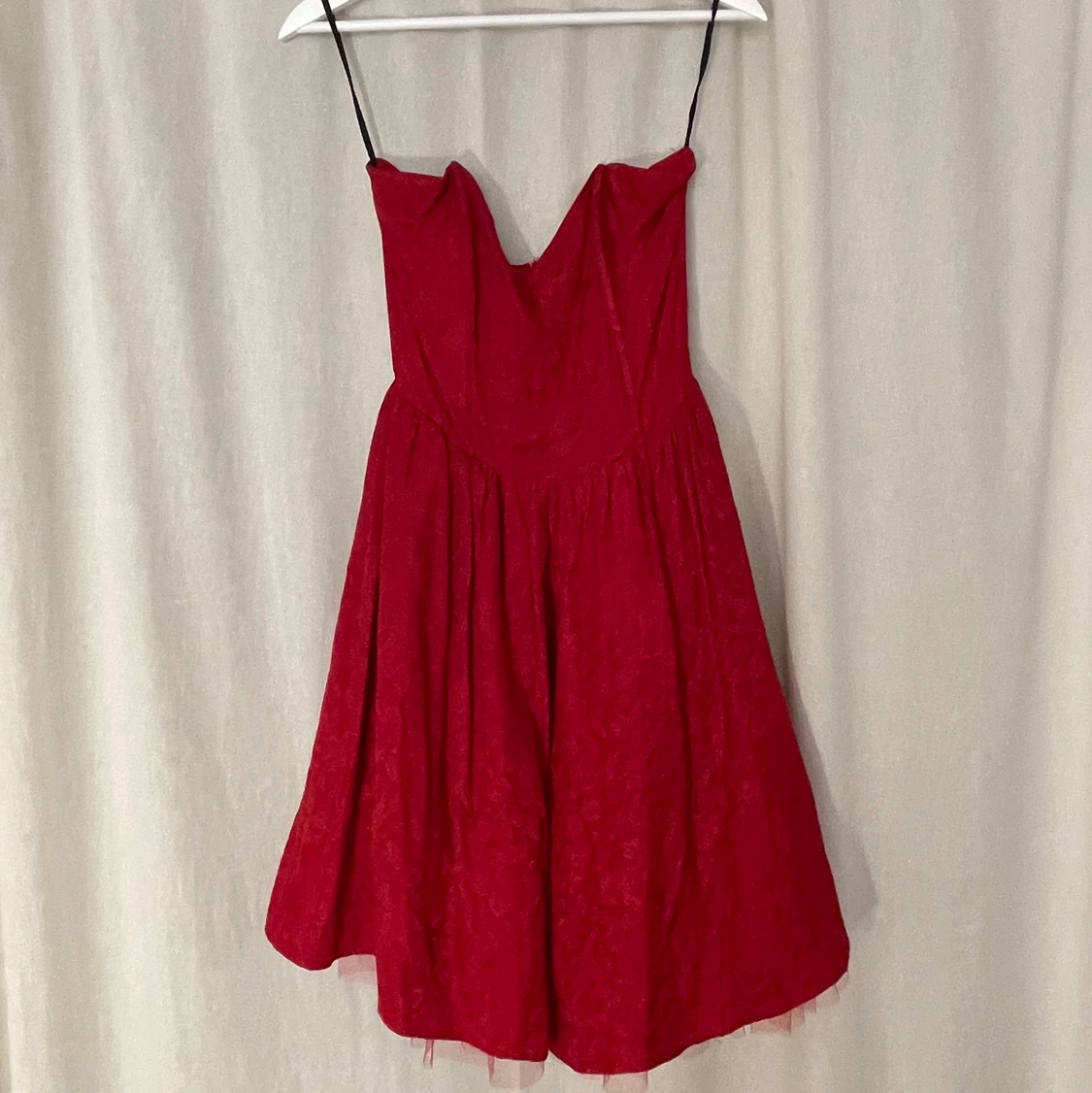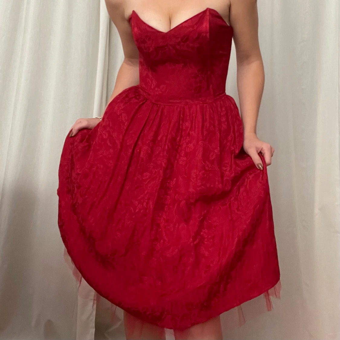 En fantastik, sexig och romantisk djupröd klänning, köpt vintage i Edinburgh och är från 90s TOPSHOP. Superfint skick, trots år på nacken. Bra passform då att den stannar uppe, knälång, passar S/M. Har ett lager tyllkjol. Jag har tyvärr aldrig använt den, men känner att den vore otroligt fin på fest, middagar, bal! Romantisk dejt! Ta den med på äventyr 💋❤️