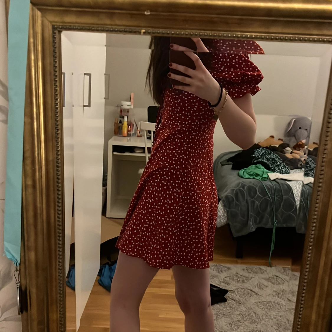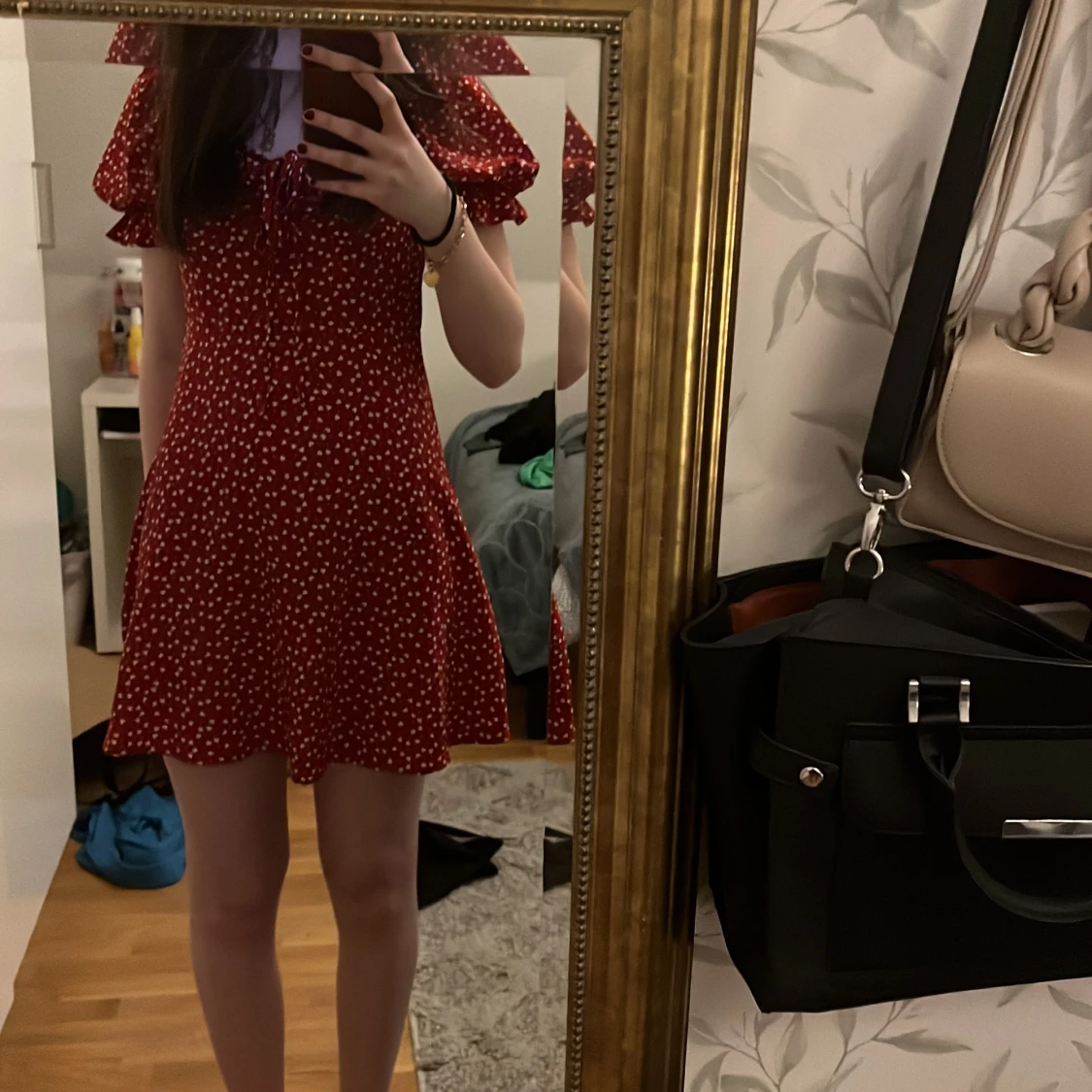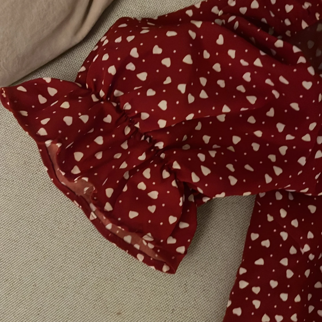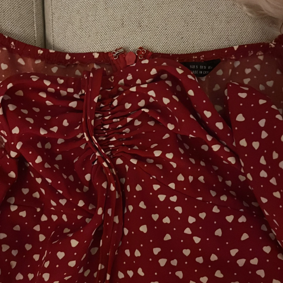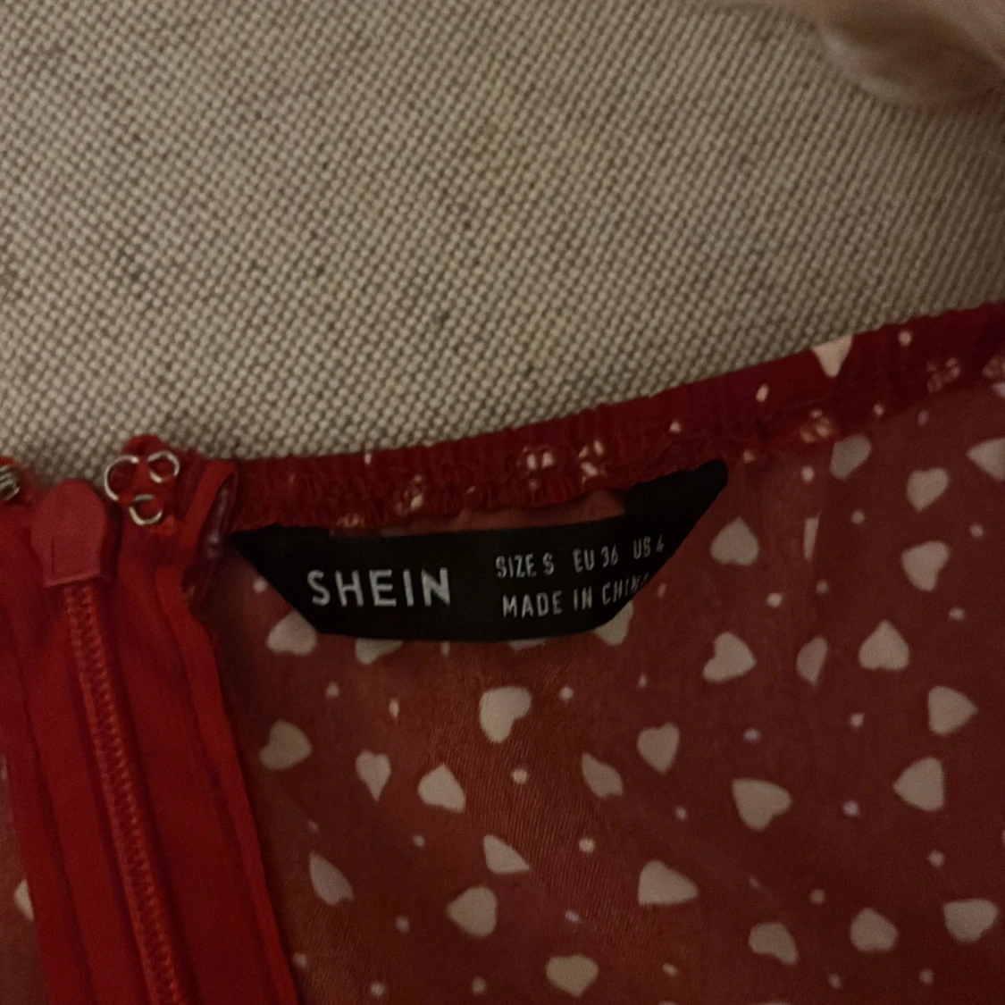 Säljer en söt röd klänning från Shein med vita hjärtan. Klänningen har en volangdetalj vid axlarna och en dragkedja i ryggen.💕