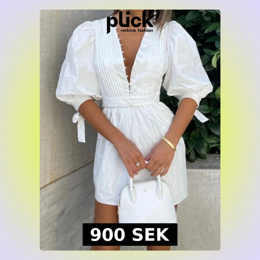 Supersöt vit kort klänning i poplin med puffärmar, djup v-ringning och knappar framtill. Klänningen har markerad midja, veckade detaljer på bröstet och knytband vid ärmsluten. Aldrig använd och prislapp fortfarande kvar. Perfekt för sommarens alla tillfällen!