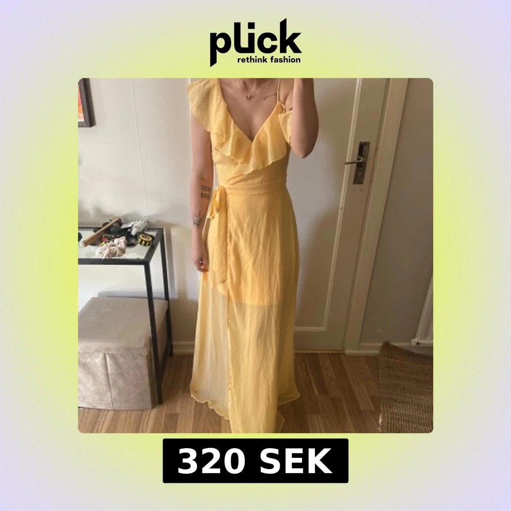 Säljer en lemonfärgad långklänning från Showpo med omlott-design, volang vid v-ringad hals och smala axelband. Klänningen har knyt i midjan och är så drömmig! Storlek S!