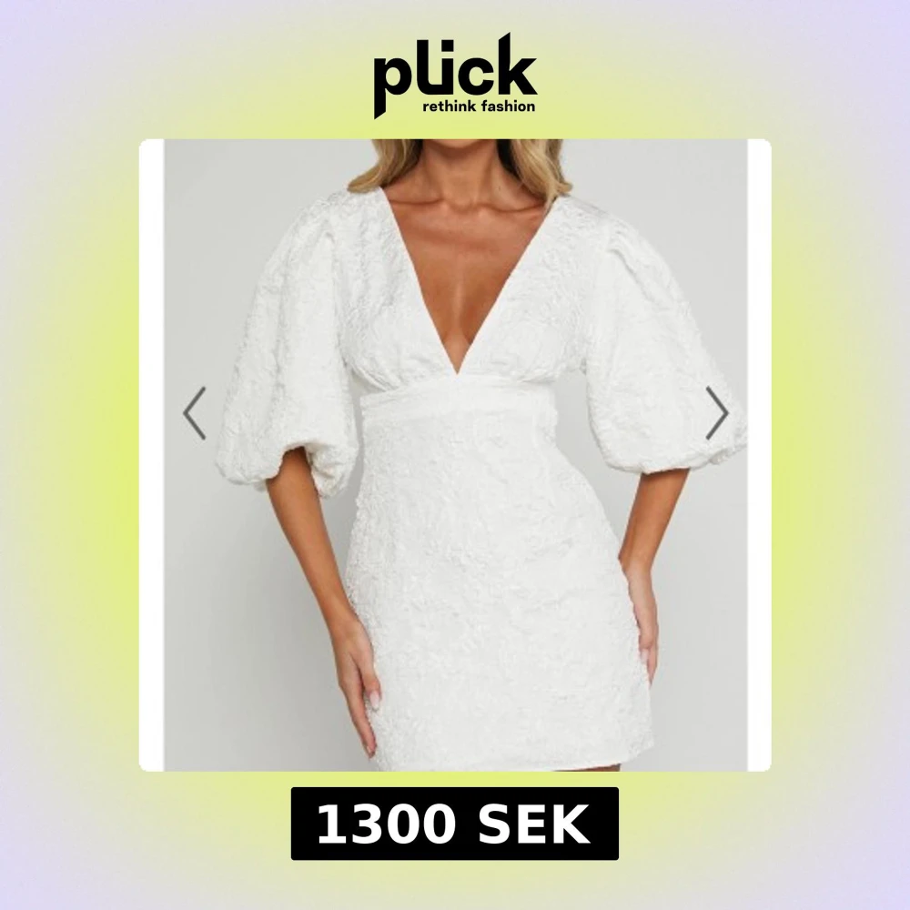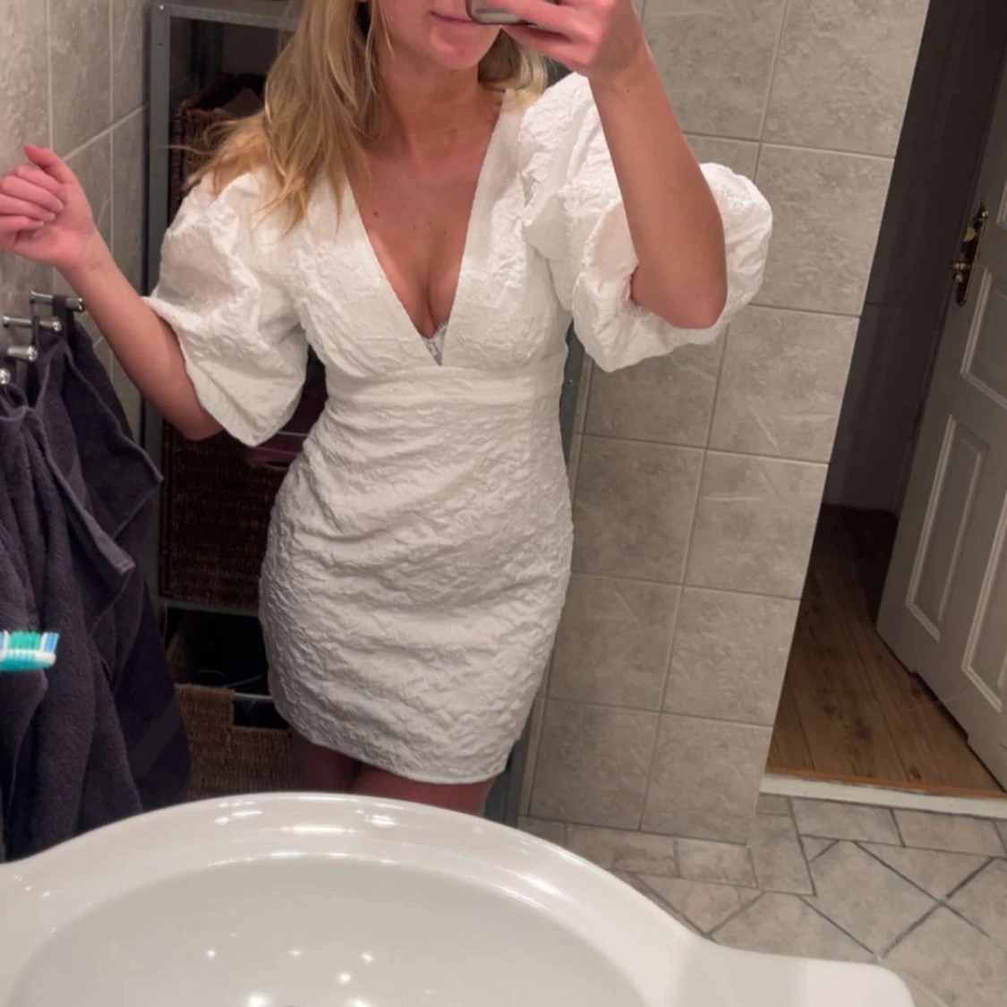 Intressekoll på en elegant vit klänning från showpo med v-ringning och puffiga trekvartsärmar. Klänningen har en kort längd och en figurnära passform som framhäver midjan. Perfekt för student! Aldrig använd o lappar kvar!🤍