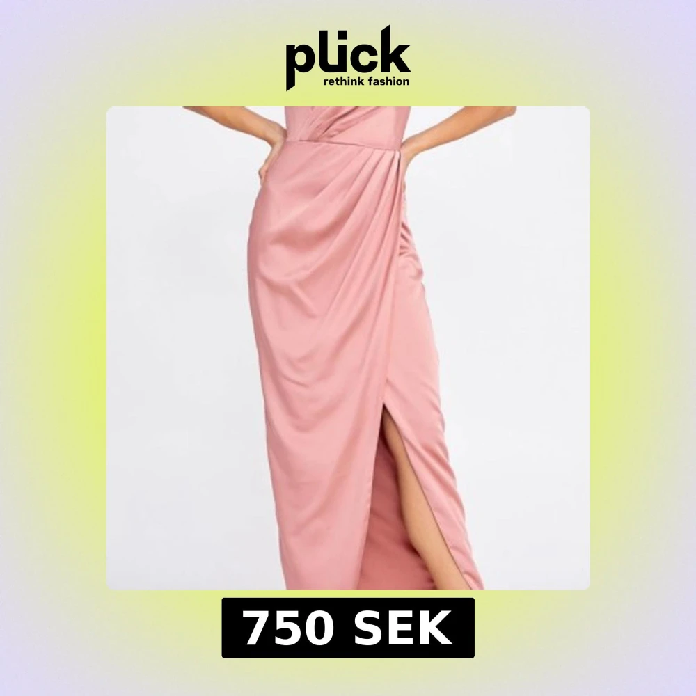 Köpt för 1500! Supersnygg axelbandslös långklänning i satin tyg, perfekt till bal, bröllop eller fest. Den sitter jättefint på kroppen och har en draperad midja och en liten slits fram. Bara använd en gång.