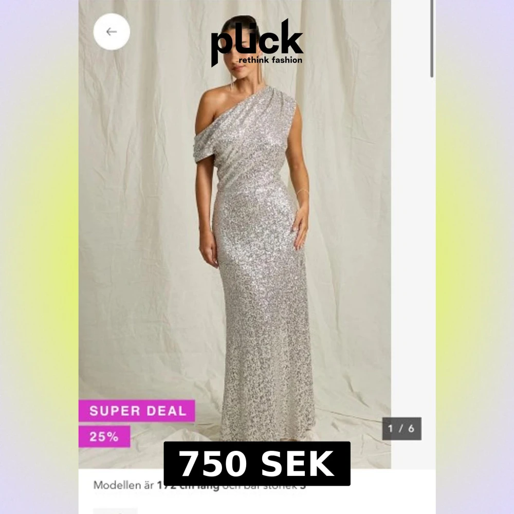 Säljer en glittrig silverfärgad maxiklänning från Joelle med paljetter över hela klänningen. Klänningen har en snygg draperad design och är oneshoulder, vilket ger en cool och elegant vibe. Aldrig använd prislapp kvar nypris 1500