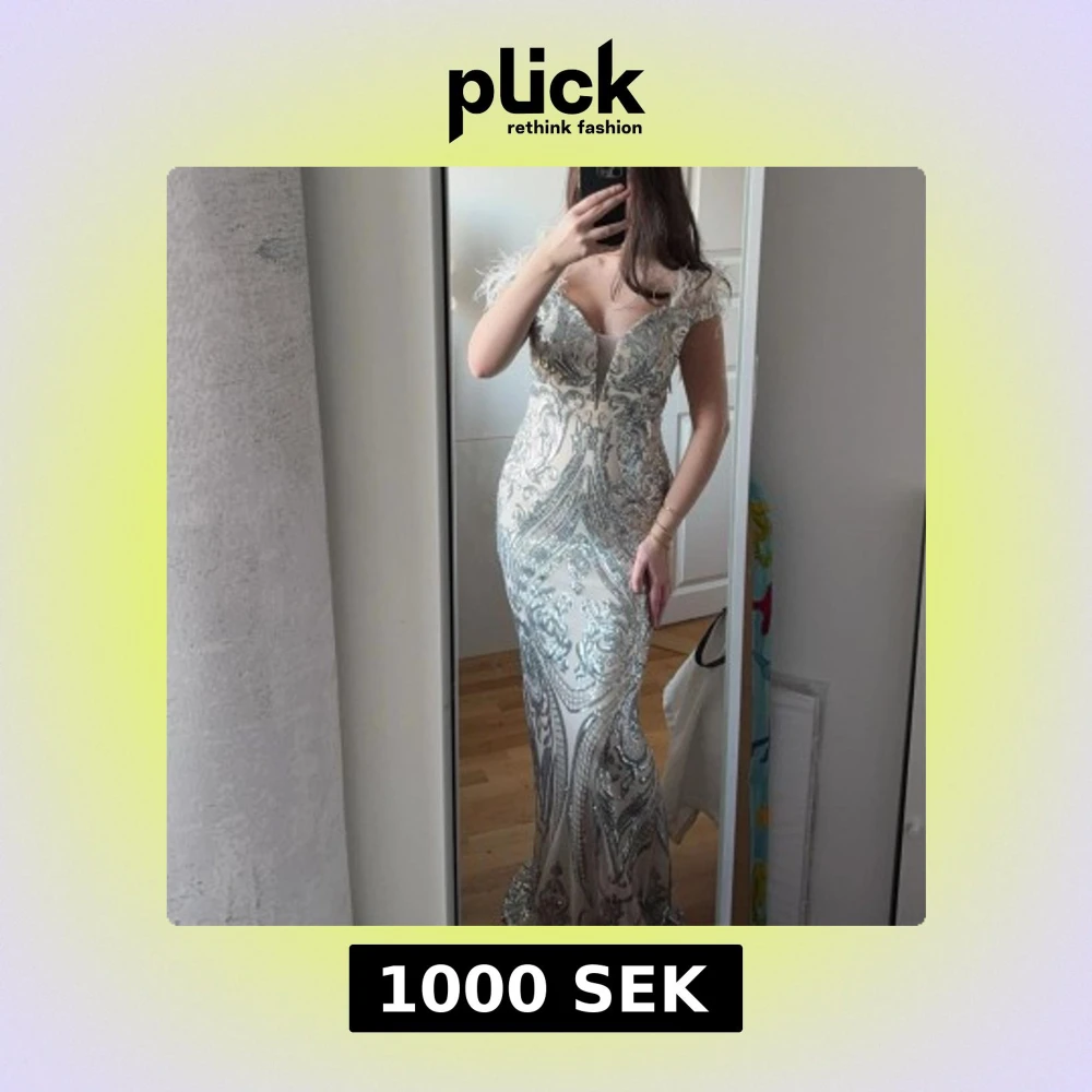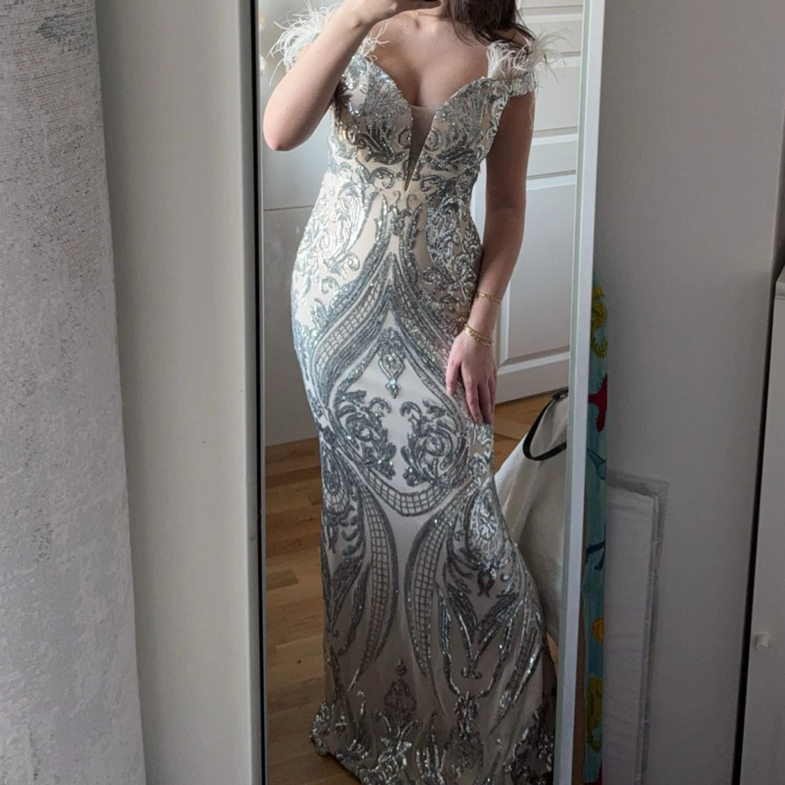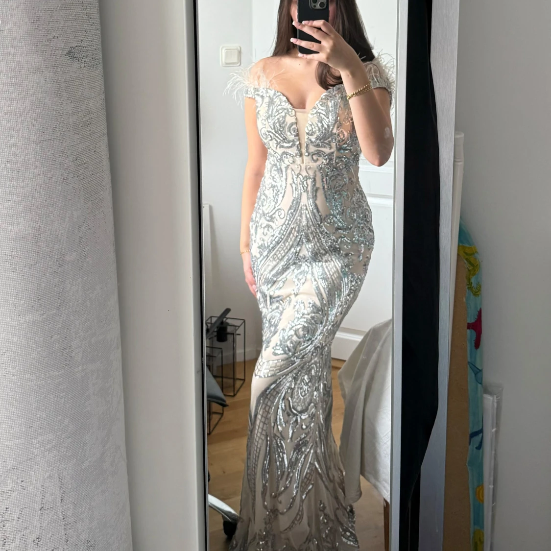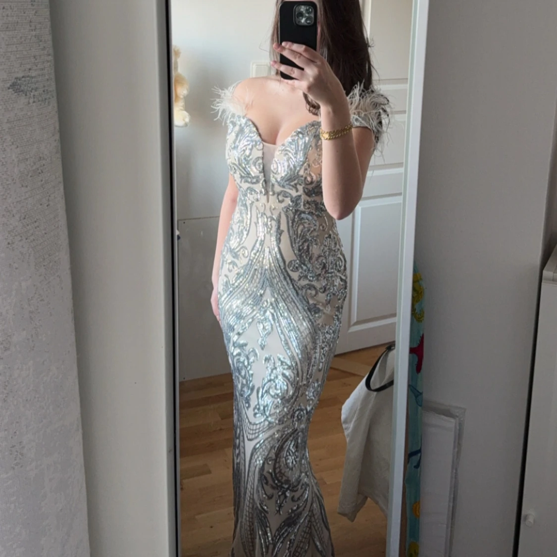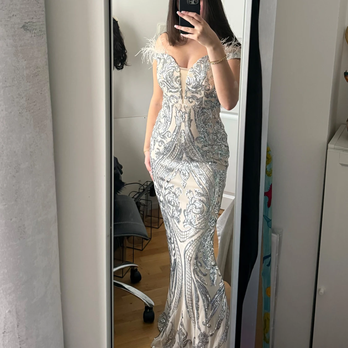Säljer en snygg långklänning i silver med glittriga paljetter. Klänningen har en figurnära passform, perfekt för bal eller fest.💕