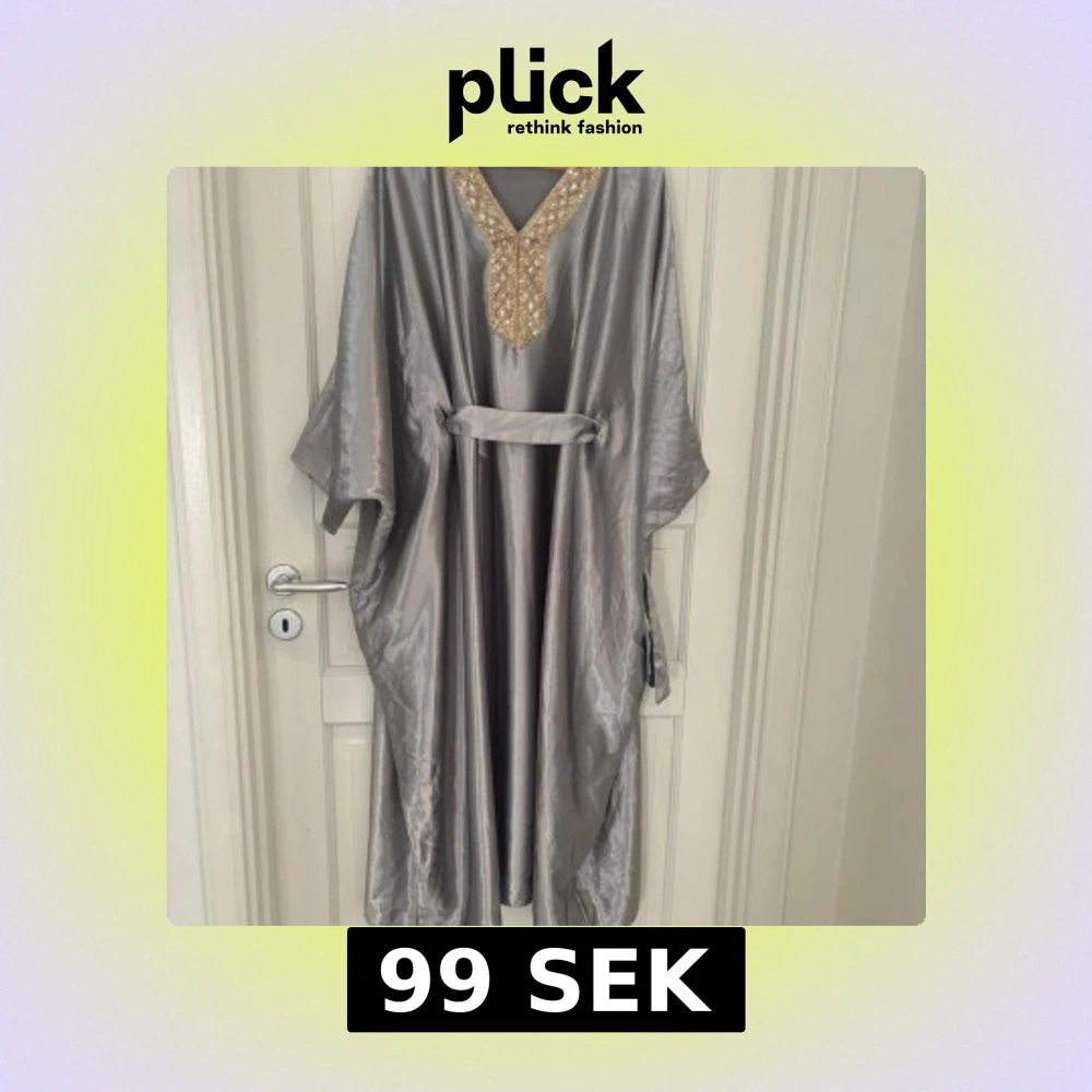 Säljer en glansig silvrig långklänning från Shein med v-ringning och vackra guldfärgade paljettdetaljer vid halsen. Klänningen har lös passform, bälte i midjan och vida ärmar. Perfekt för dig som vill sticka ut med en elegant look.