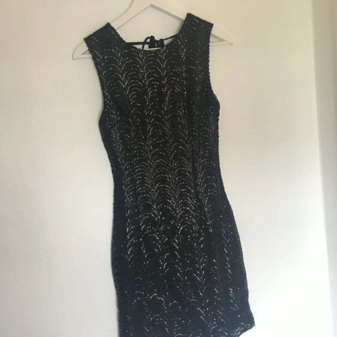 Svart paljettklänning med öppen rygg och knytning i ryggen