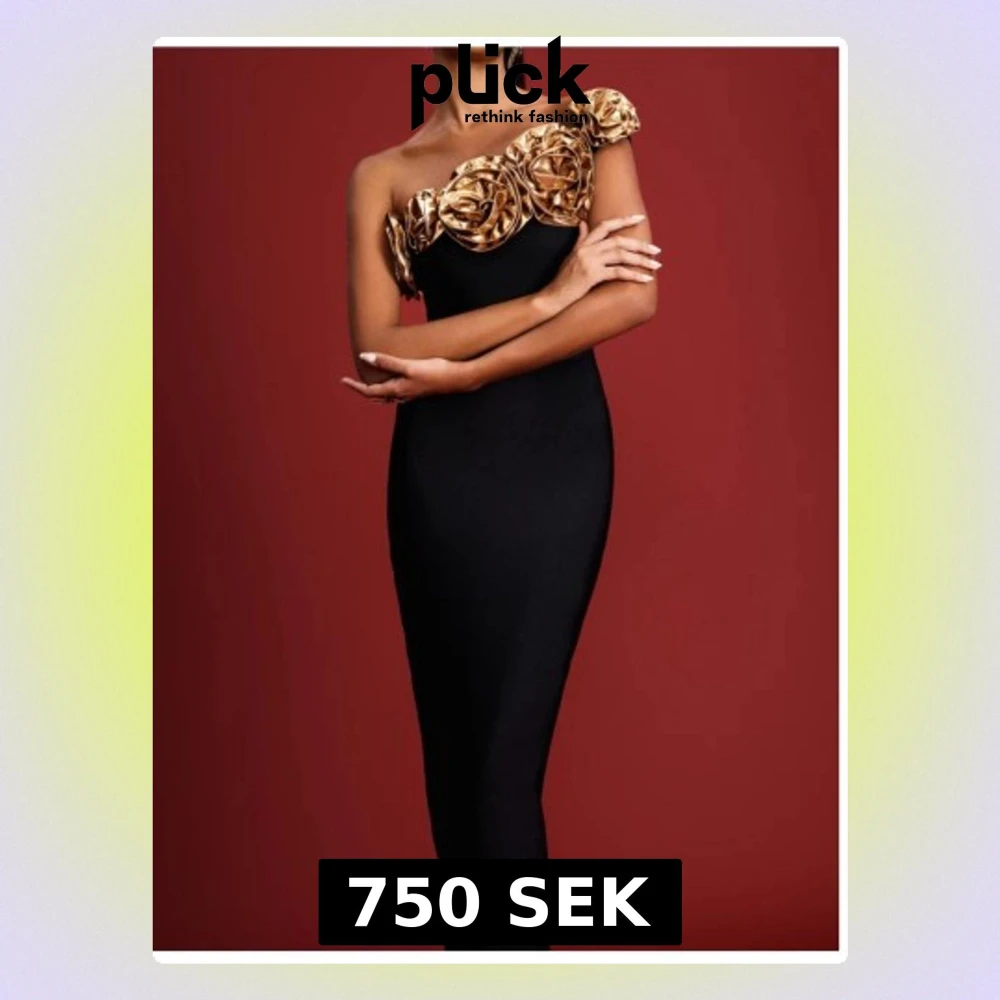Supersnygg svart långklänning med en axel och stora dekorativa rosor i guld längs halsringningen. Klänningen har en figurnära passform och är axelbandslös, vilket ger en elegant och modern look. Perfekt för dig som vill sticka ut med en unik detalj.