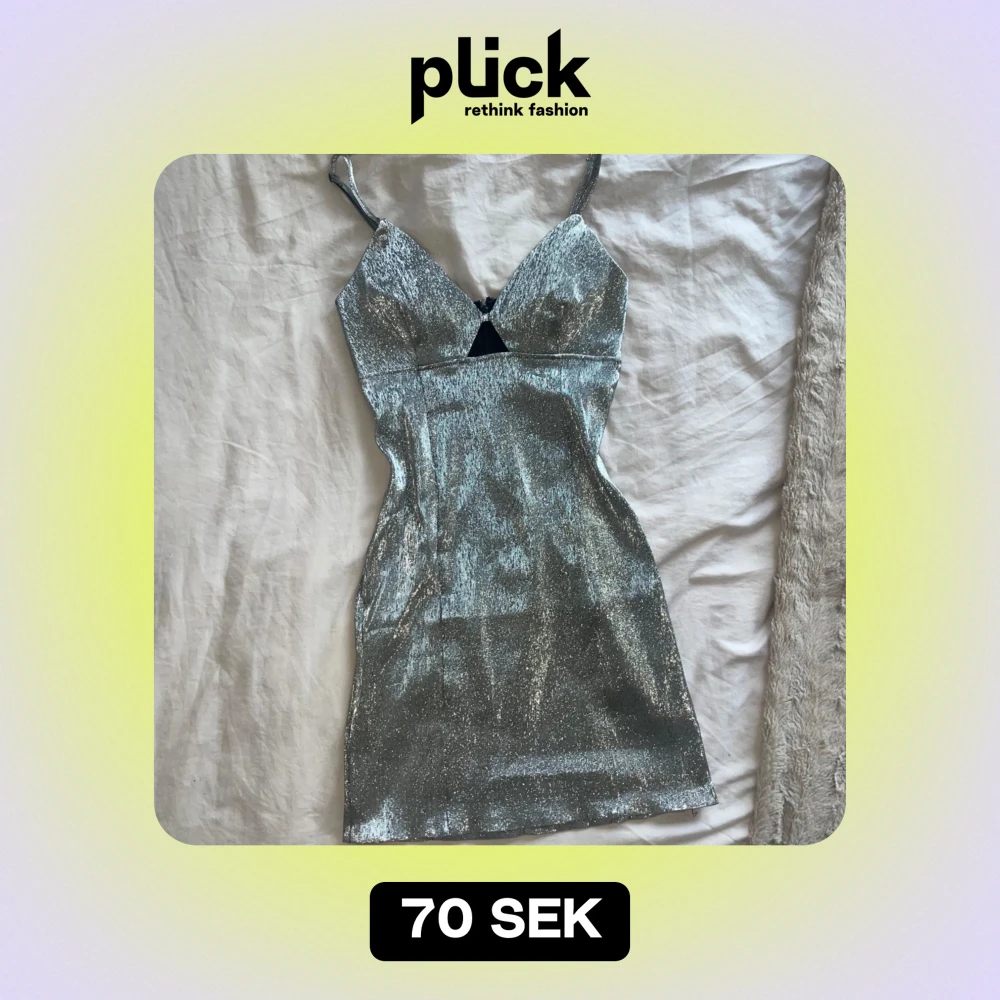 Snygg glittrig silverklÀnning med smala axelband och en figurnÀra passform. Perfekt för en kvÀll ute med vÀnner eller nyÄr. KlÀnningen har en kort lÀngd och en v-ringning framtill.