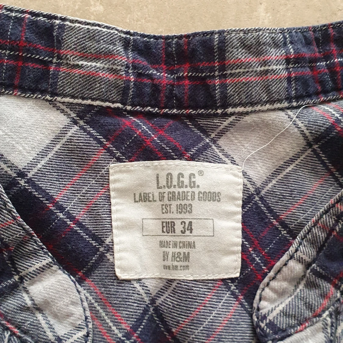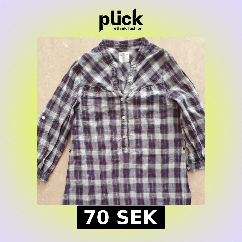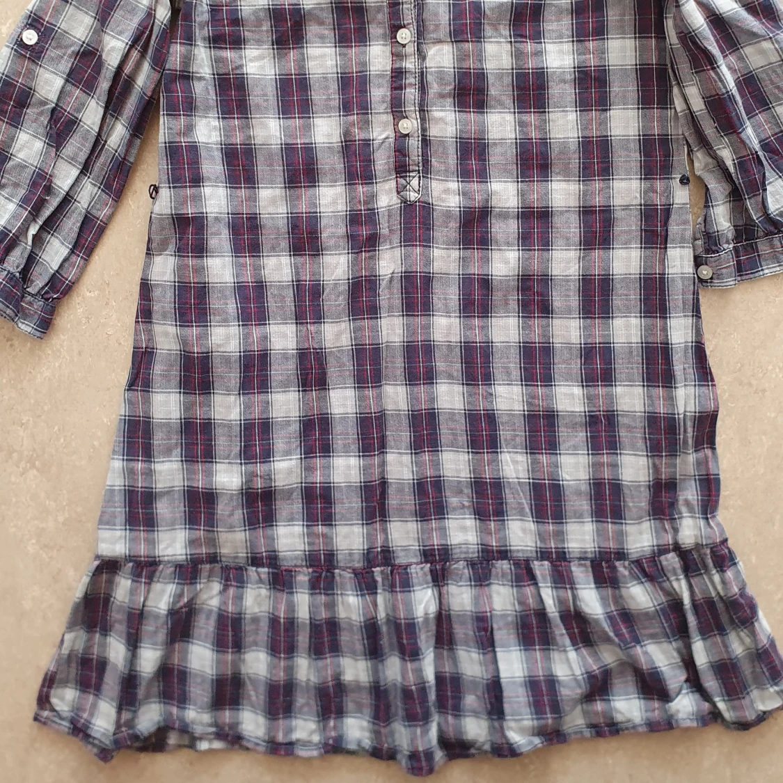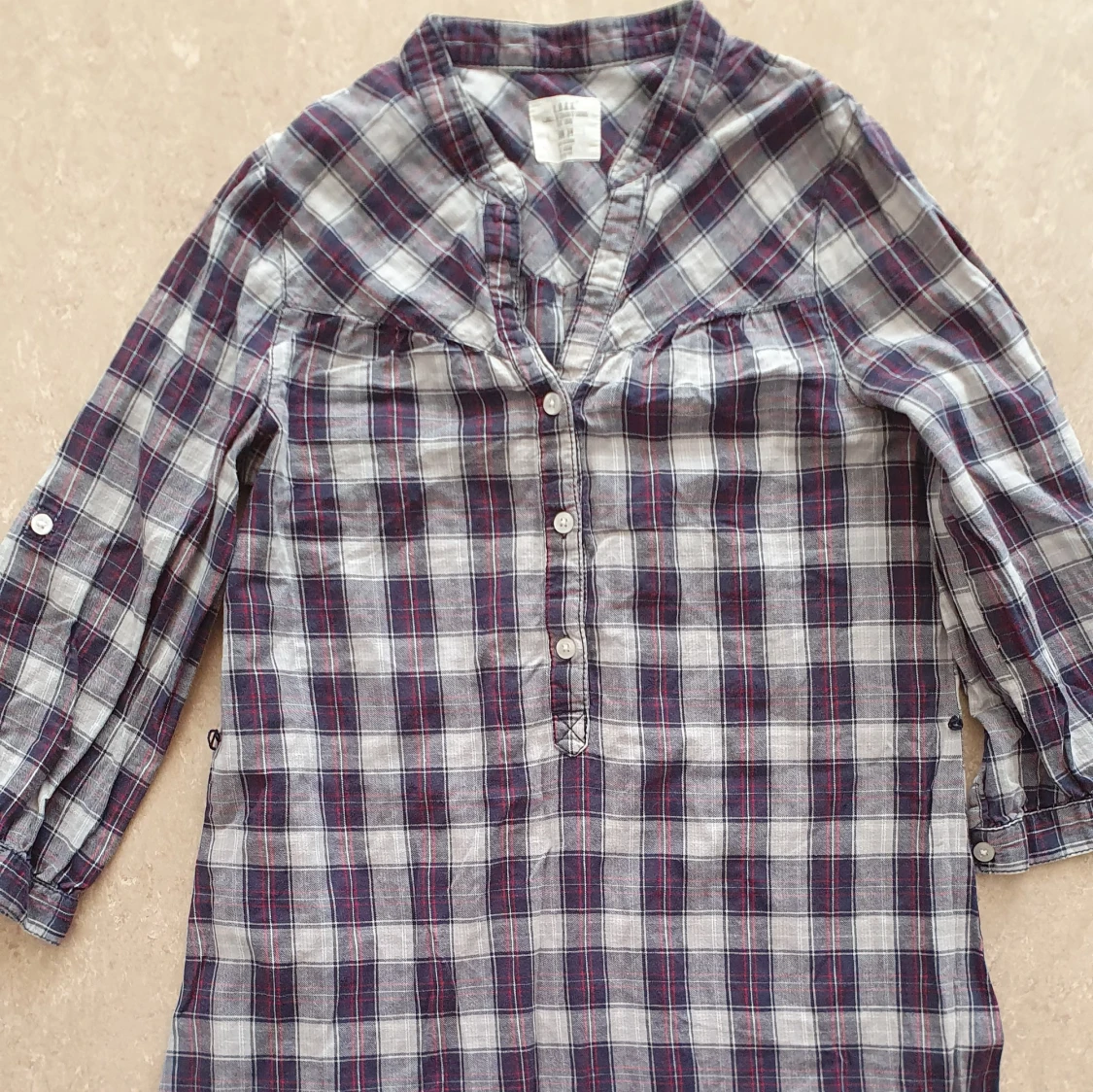 Rutig skjortklänning från H&M i blått, vitt och rött. Klänningen har knappar framtill, trekvartsärmar med knappdetalj och volang nertill. Tillverkad i mjuk bomull, perfekt för en avslappnad och cool look.