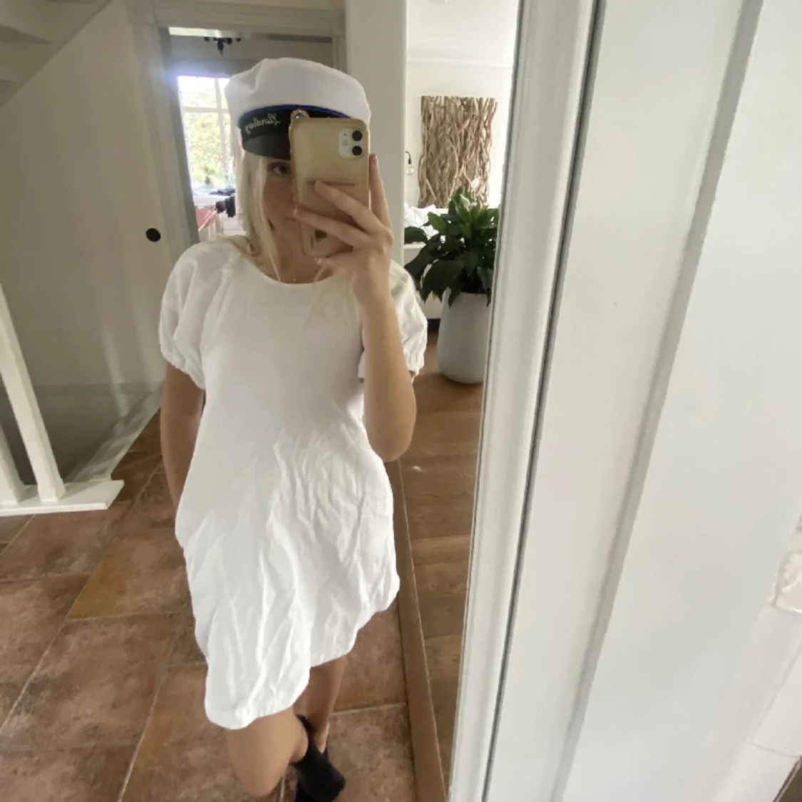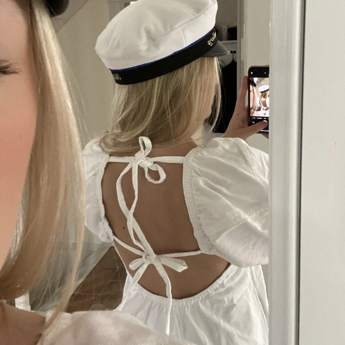 Helt oanvänd, bara testad. Har fickor! Jättefin vit kort klänning perfekt till studenten. Har lite puffärmar och öppen rygg med justerbara band!🫶🏻