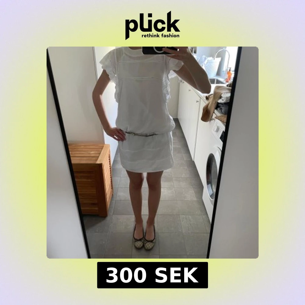 Söt vit klänning med volangdetaljer på axlarna och raka linjer. Klänningen är ärmlös med breda volanger och har en lös passform. Medföljer en enkel vit underklänning med smala axelband. Perfekt för sommarens varma dagar. Det finns även ett tunt vitt band som man kan knyta i midjan, se sista bilden. Från Howtokissafrog, storlek 14 år men passar XS/S