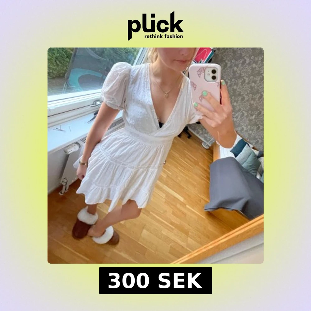 Säljer en söt vit kortklänning med puffärmar och v-ringning. Klänningen har fina spetsdetaljer och en omlott-design. Perfekt för sommaren och skolavslutning! Den är använt sparsamt🥰