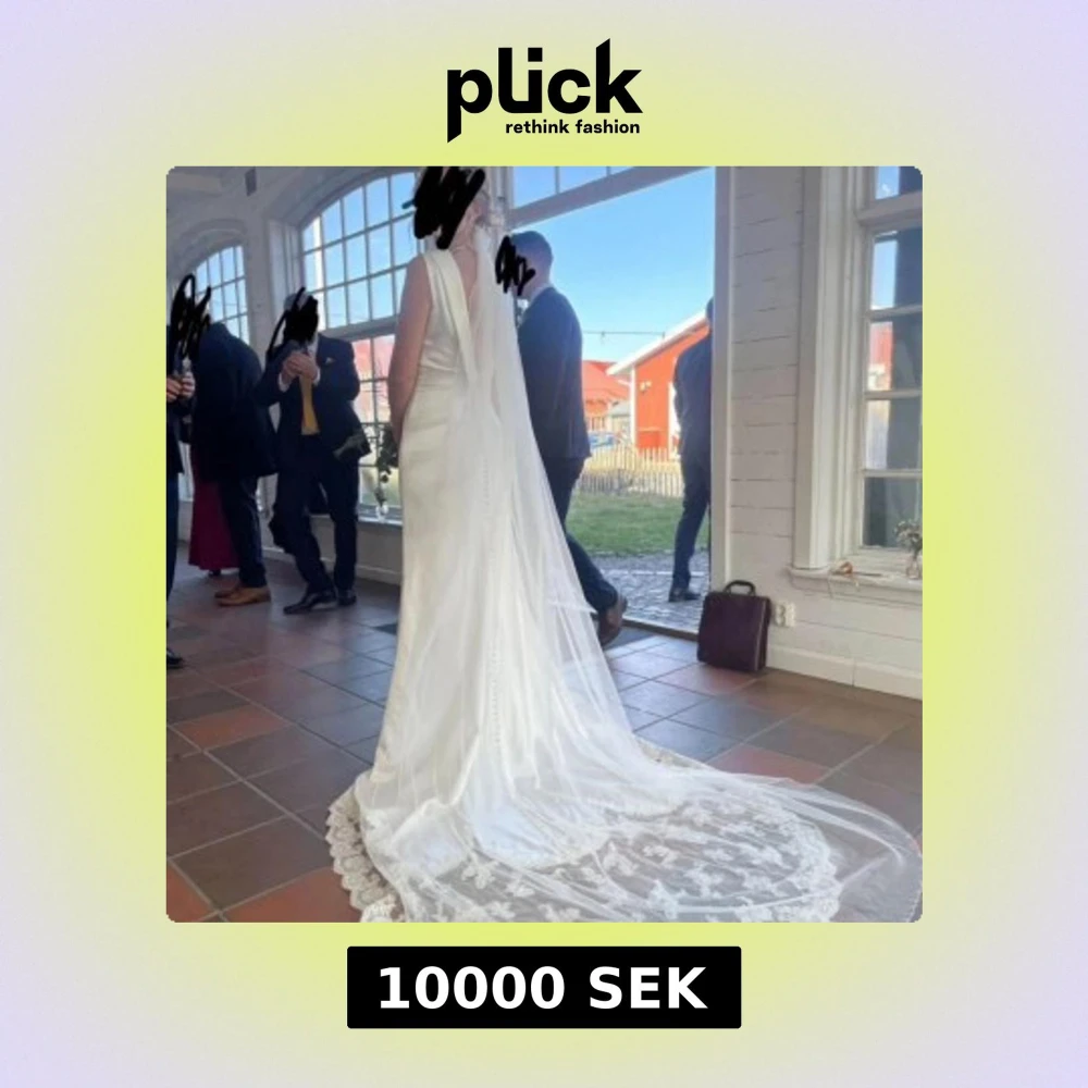 Min fina tidlösa bröllopsklänning och även skor om det önskas. Den var i nyskick när jag använde den och är fortfarande i gott skick. Inga slitningar endast lite smutsig under släpet och i ”kragen” så går absolut att tvätta. Skorna säljs för +200kr. något mer slitna men passar så fint till materialet på klänningen. De är i storlek 38/39. Klänningen är figursydd enligt mina mått och jag är en 36a o 170cm lång. insydda bh kuddar så man behöver inget under. Knappar längst hela ryggen.