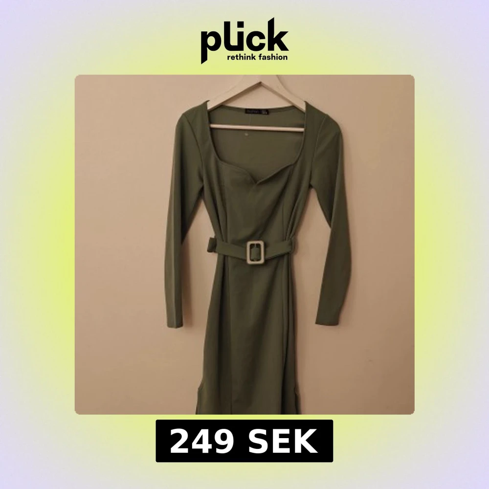Snygg olivgrön klänning från Boohoo med lång ärm och markerad midja tack vare ett matchande bälte med silverfärgat spänne. Klänningen har en smickrande fyrkantig ringning och figurnära passform. Perfekt för dig som gillar stilrena och trendiga plagg.