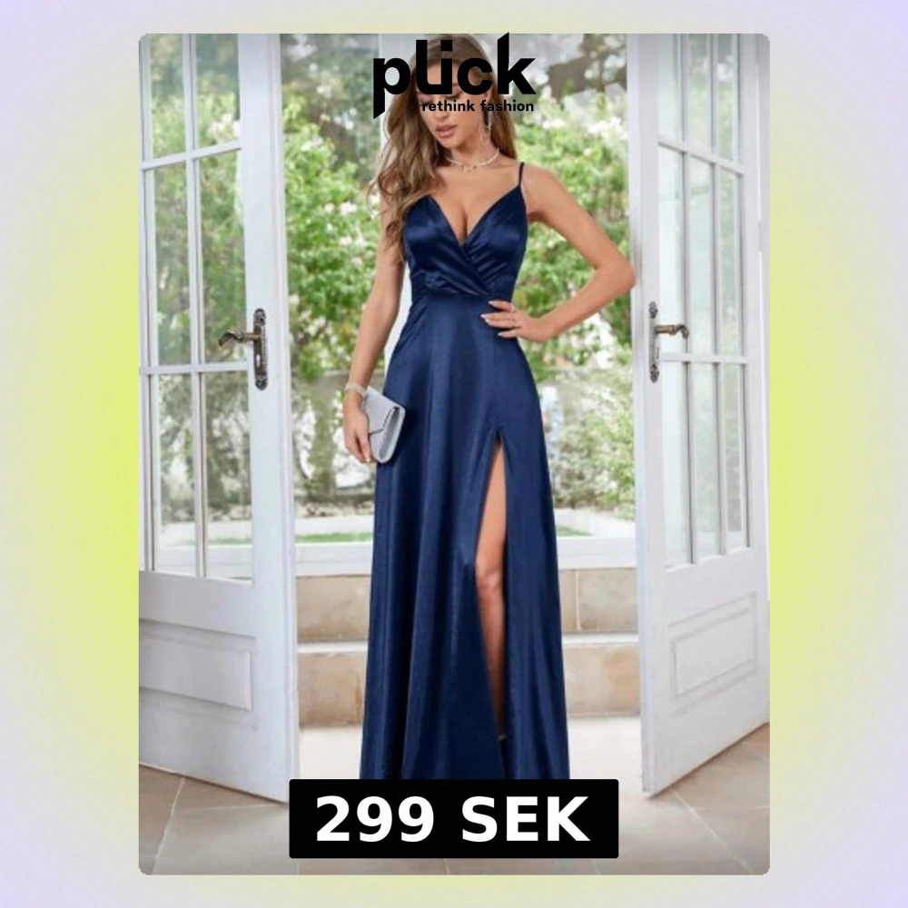 Säljer en marinblå långklänning i glansigt material med smala axelband, djup v-ringning och hög slits framtill. Klänningen har en figurnära överdel och faller snyggt ner mot golvet. Perfekt för bal eller festkväll! Köpt från SHEIN!!! Orginalpris 479 säljer för 299. Inget tecken på användning men använde på min lärarmiddag😽strl S