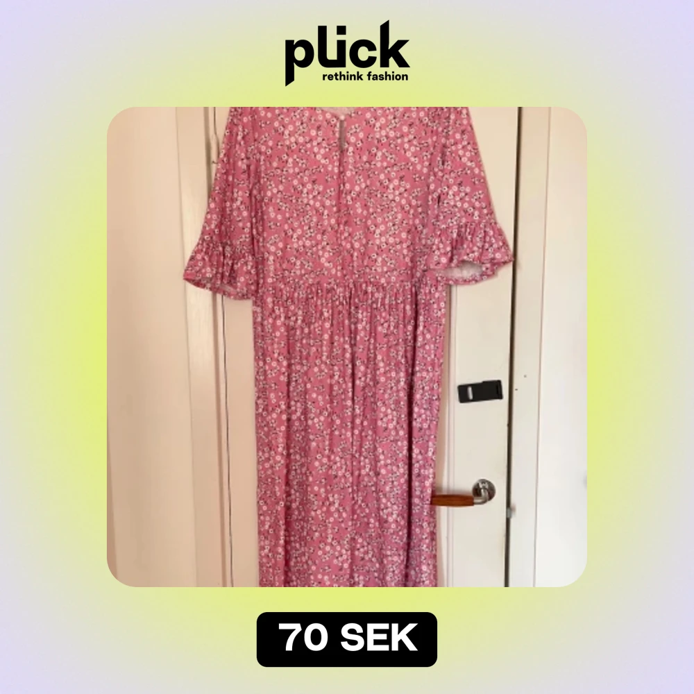 Småblommig långklänning med volanger vid ärmslutet. Stl M enligt lapp men rymlig i passformen. Aldrig använd då den tyvärr blev för stor för mig.