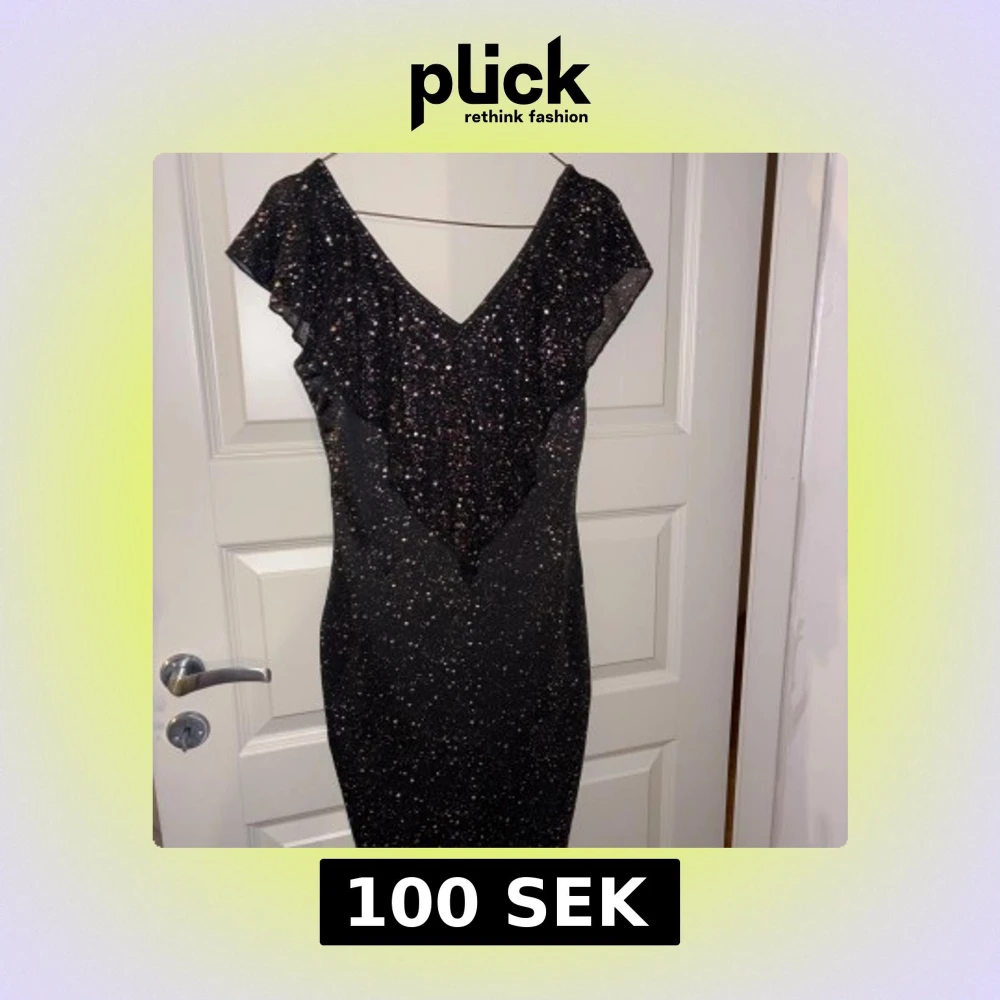 Supersnygg svart långklänning med glittrigt tyg och v-ringning. Klänningen har volangdetalj över axlarna och en figurnära passform. Perfekt för dig som vill sticka ut med lite extra glitter.
