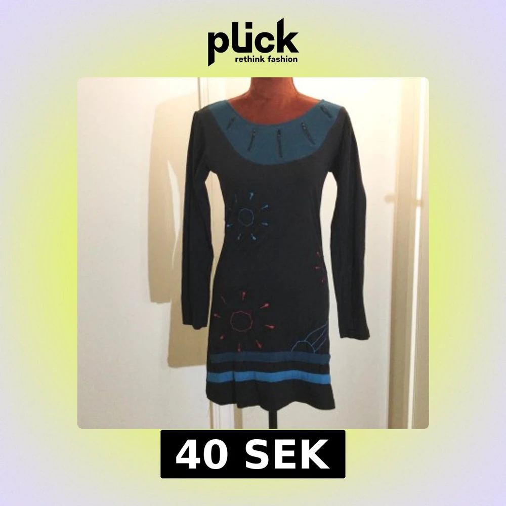 Unik klänning med lång ärm och rund halsringning. Klänningen har broderade detaljer i blått och rött samt dekorativa dragkedjor vid halsen. Två blå ränder nertill ger extra stil. Tillverkad i mjukt material, perfekt för dig som vill sticka ut. Klänning Svart med mönster Strl: S