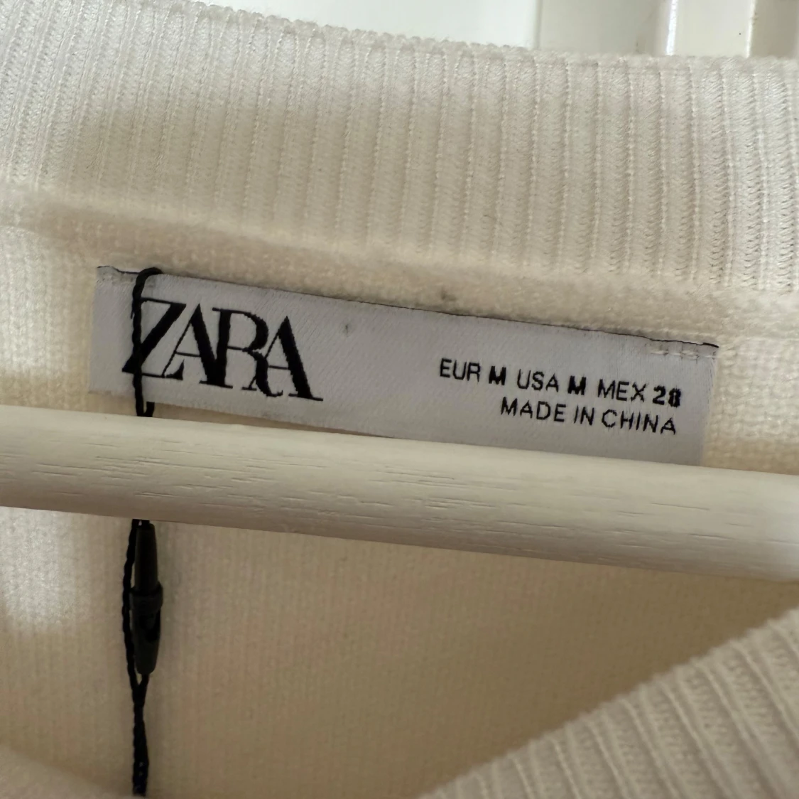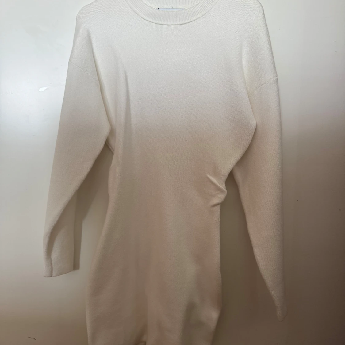 Helt ny enkel och stilren vit stickad klänning från Zara i storlek M men passar S. Klänningen är figursydd, snatched i midjan, har lång ärm och är i en kort modell. Materialet är slätt och mjukt, perfekt höstklänning🤍Prislapp kvar