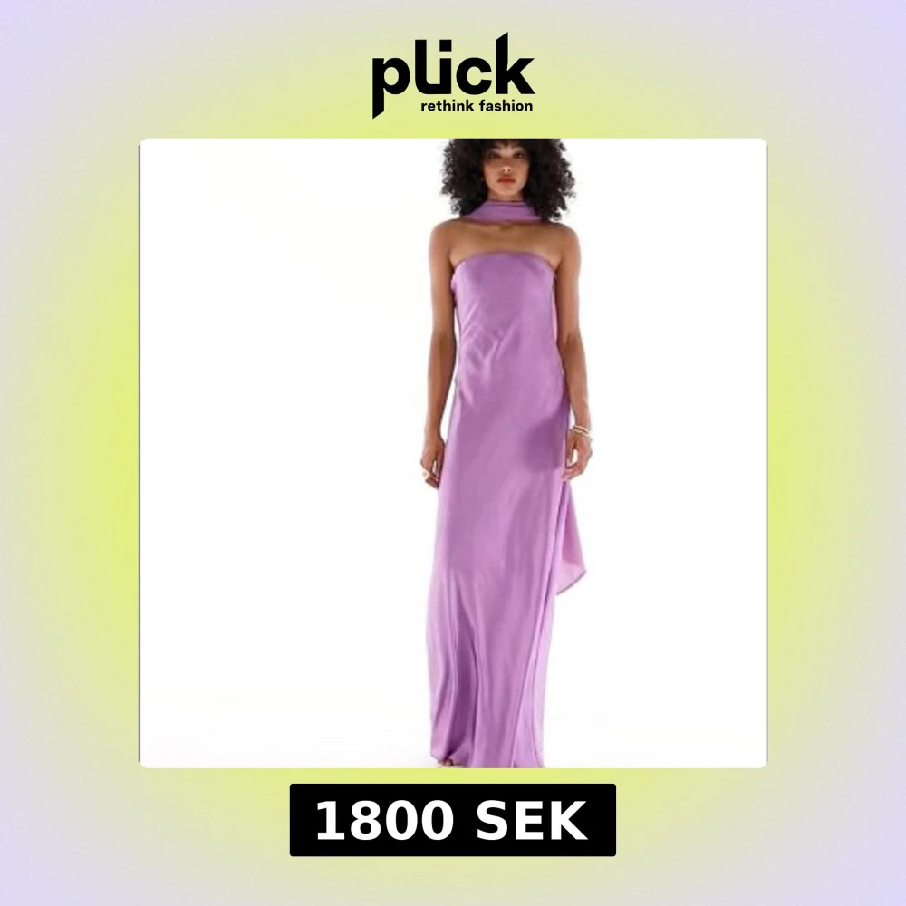 Supersnygg lila långklänning med halterneck och släp baktill. Klänningen är axelbandslös och har en mjuk, glansig satinfinish. Klänningen är helt ny med prislapp och är köpt för 2092!!!