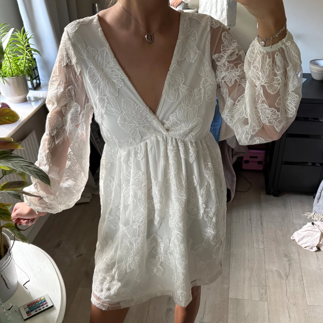 Superfin vit kortklänning med v-ringning och öppen rygg, passar alldeles perfekt till studenten eller midsommar.