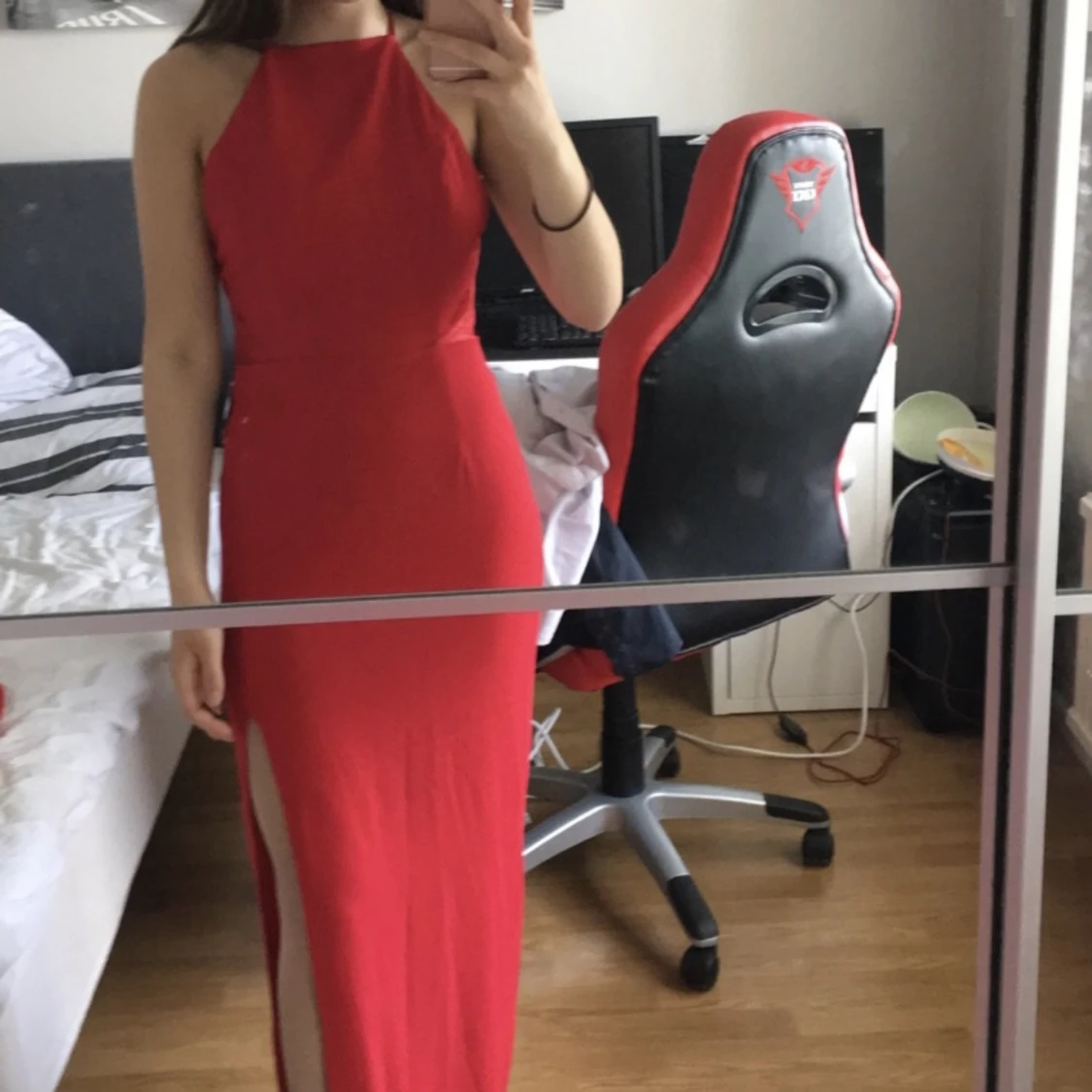 Röd klänning som går ner till golvet. Använd en gång, perfekt till bal/skiva. Superfin i ryggen! Skriv för fler bilder.