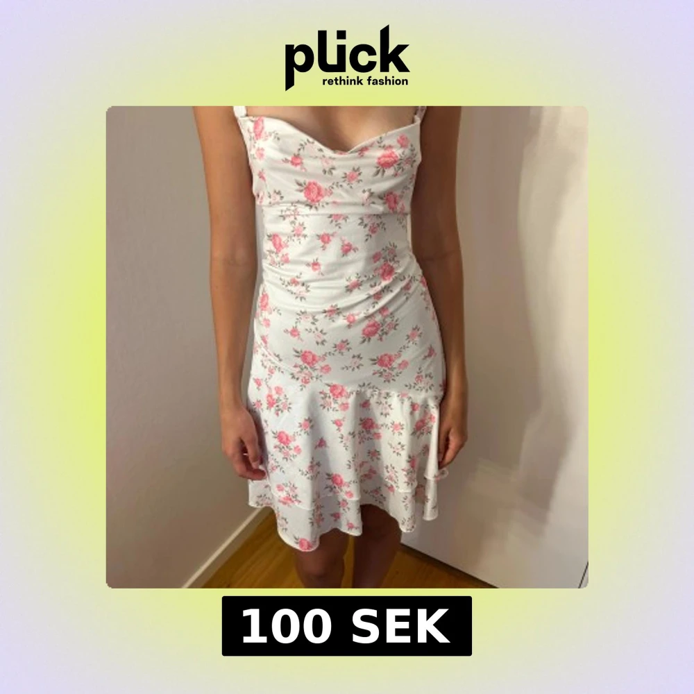 Supersöt vit kortklänning med rosa blommigt mönster och volang nertill. Klänningen har smala axelband, lätt draperad byst och är figurnära med en flowy kjol. Perfekt för sommaren.