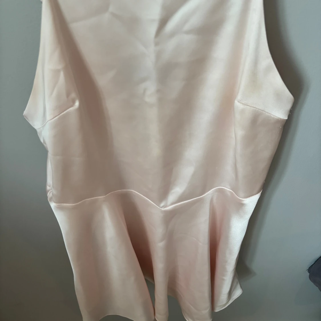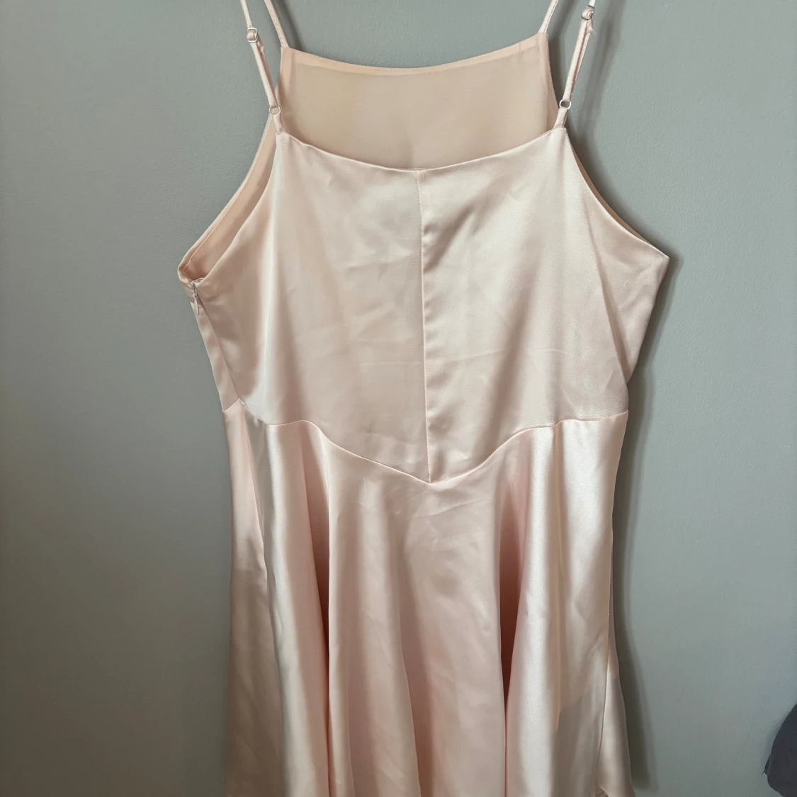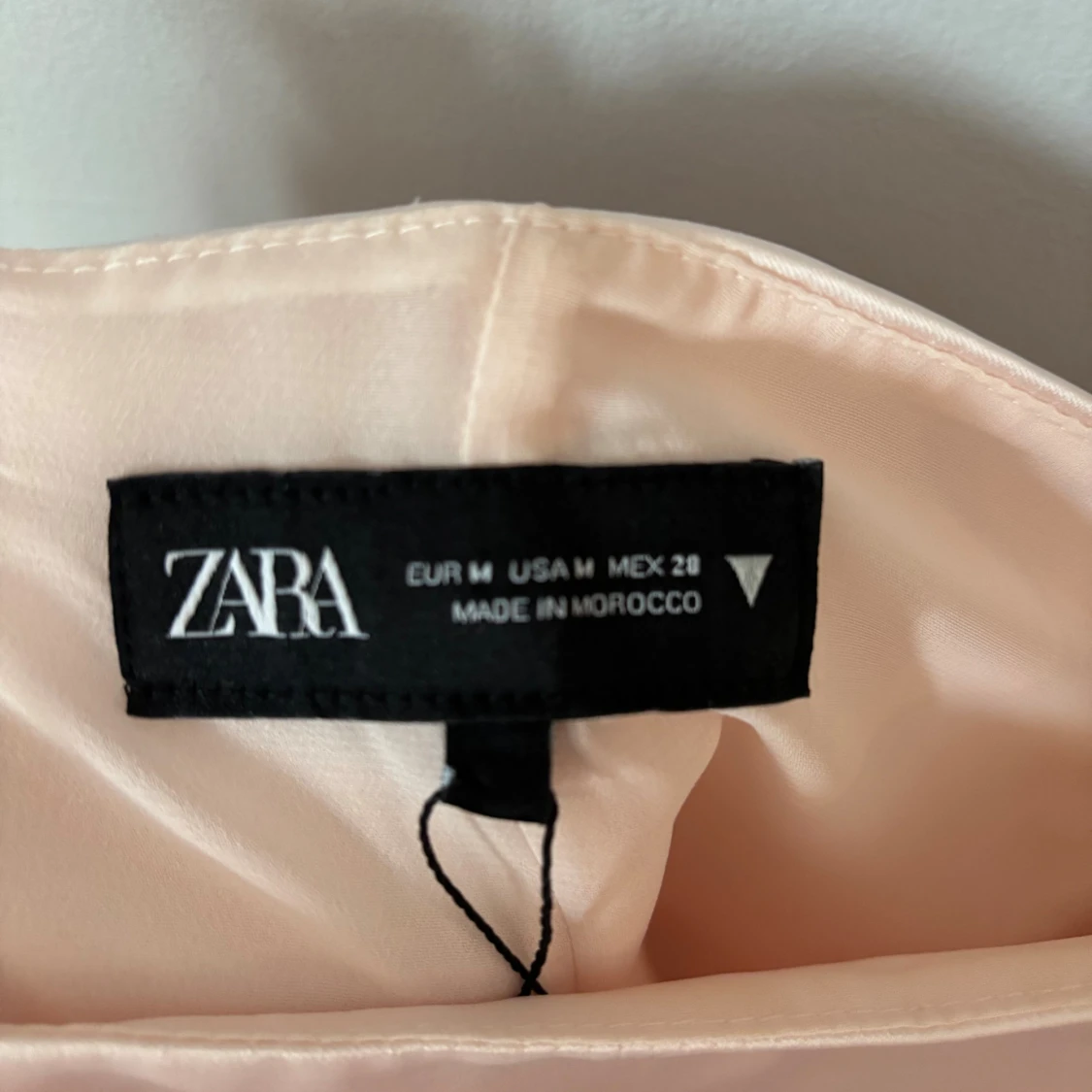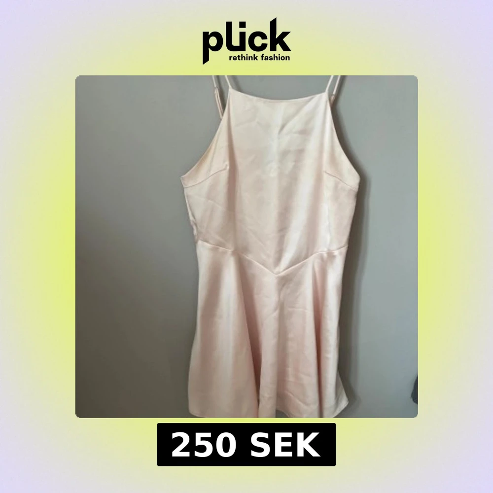 Säljer en elegant kortklänning från Zara i ljusrosa satin. Klänningen har smala axelband och en mjukt utsvängd nederdel som ger en snygg siluett. Perfekt för dig som gillar minimalistisk stil med lyxig känsla.