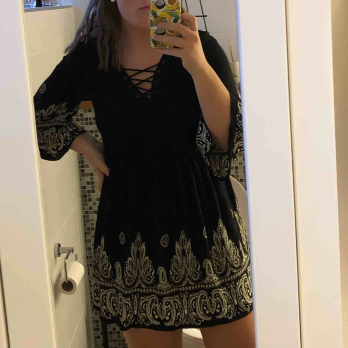 Snygg klänning använd fåtal gånger! Snyggt mönster som ändå inte är för mycket kan lätt kläds ner till en ”vanlig” dag och kläs upp till en fest! Snygg detalj ifrån som visar lite hud (frakt tillkommer) KÖP SÅÅ SNYGG