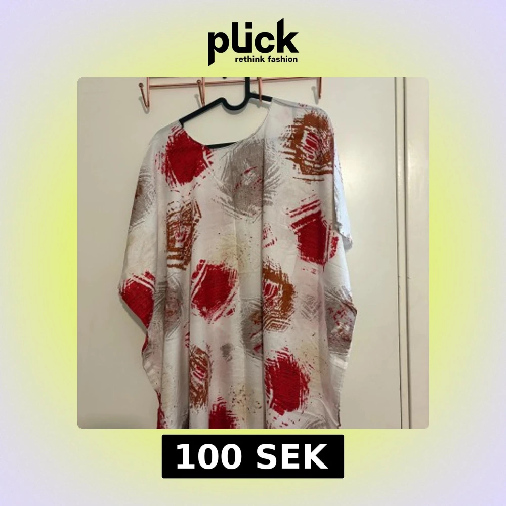 Luftig långklänning i vitt med stora abstrakta mönster i rött, brunt och grått. Klänningen har lös passform, rund halsringning och korta ärmar. Perfekt för dig som gillar färg och unika prints. Materialet känns lätt och svalt.storlek one seize