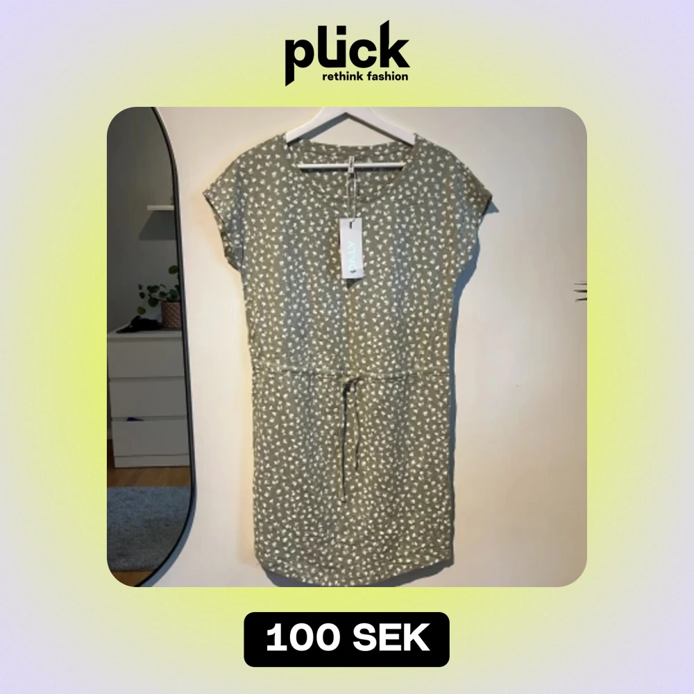 Säljer en olivgrön klänning som är aldrig använd. Prislappen hänger kvar också. Köpt för 130kr och säljer för 100kr istället. Ett snöre vid midjan som du kan göra en rosett av. Gott skick!