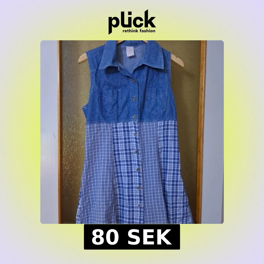 Snygg ärmlös klänning med jeansöverdel, krage och två bröstfickor. Nederdelen är i blåvitt rutigt tyg och hela klänningen har knappar framtill. Fint skick:)