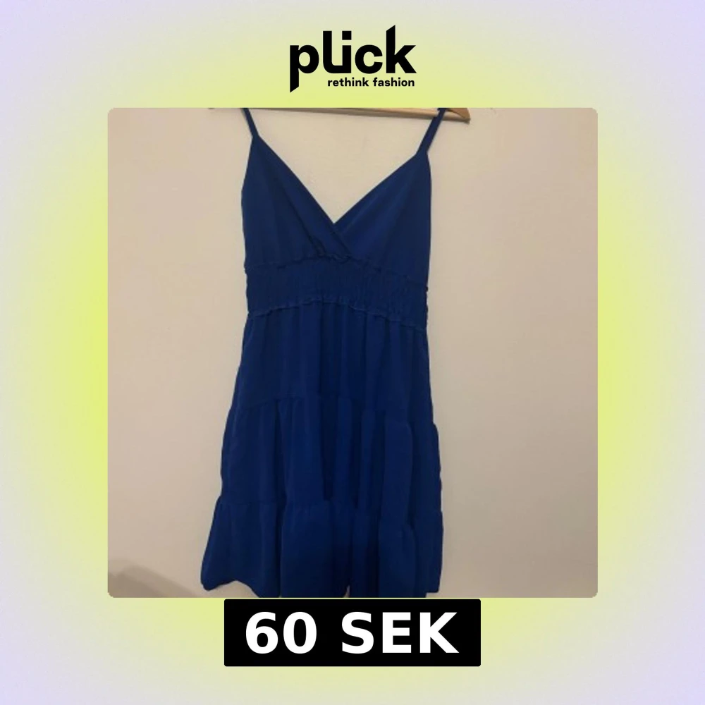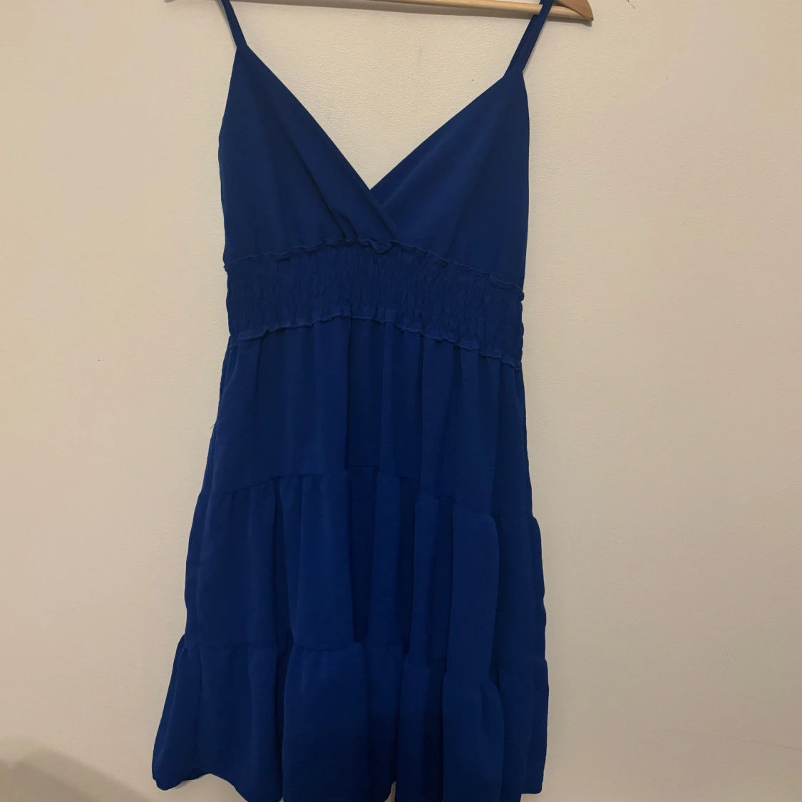 Supersöt blå klänning med smala axelband och v-ringad omlott framtill. Klänningen har smock i midjan och flera volanglager som ger en flowy känsla. Perfekt för varma dagar och somriga vibes.