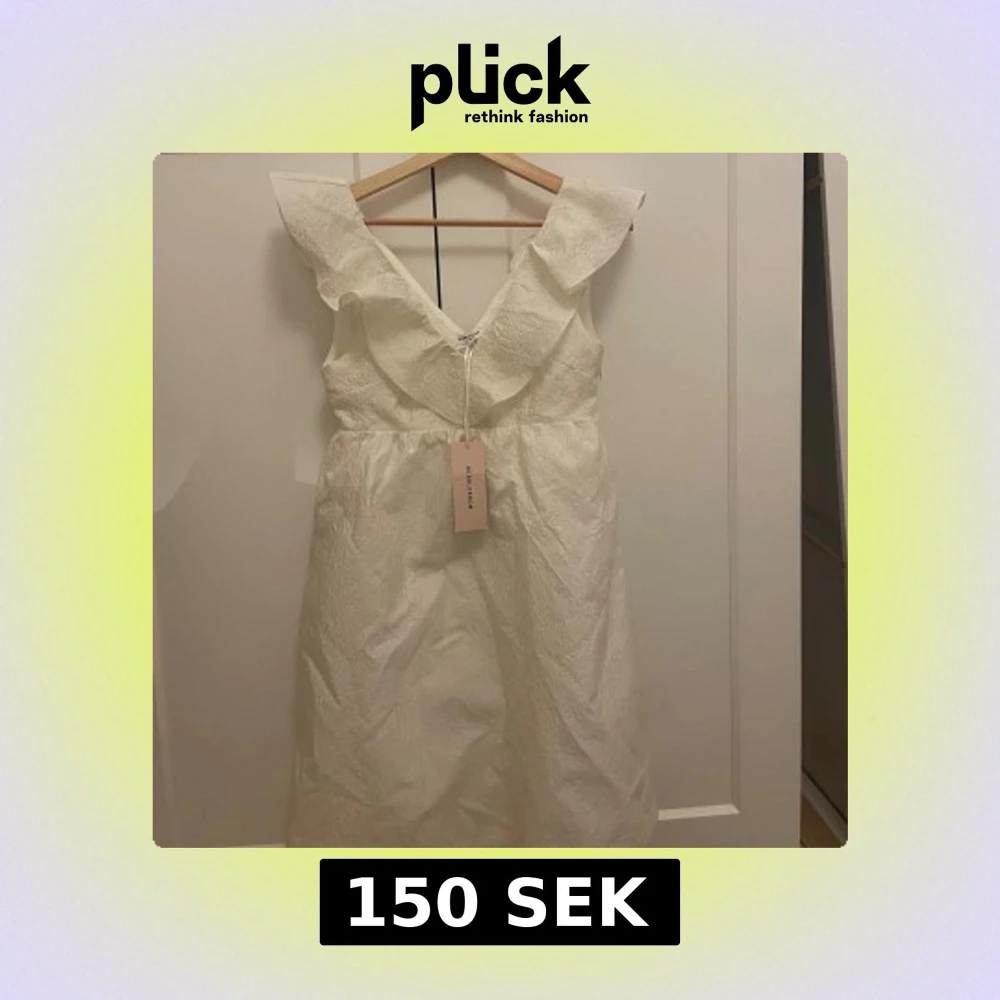 Supersöt vit klänning från Bubbleroom i modellen Viva Dress. Klänningen har v-ringning, bred volang runt axlarna och ett vackert blommigt strukturmönster i tyget. Den är ärmlös och har en kort längd, perfekt för sommarens alla tillfällen.