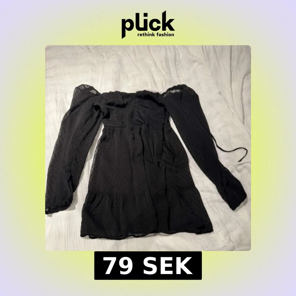 Supersöt svart kortklänning från H&M Divided med långa genomskinliga puffärmar och diskret prickigt mönster i tyget. Klänningen volang nertill och är tillverkad i ett lätt, flowy material som ger en luftig känsla samt knyte i ryggen 😍
