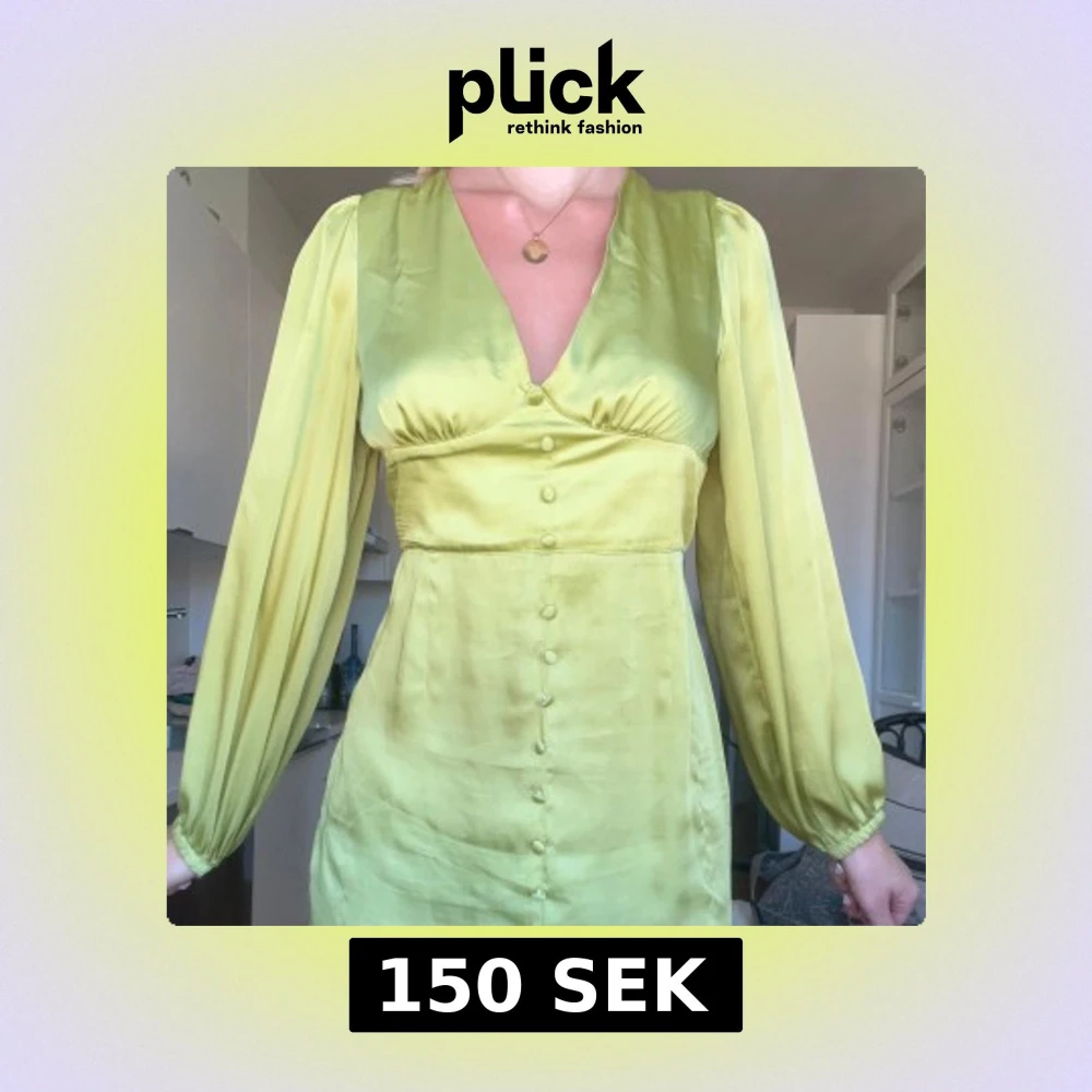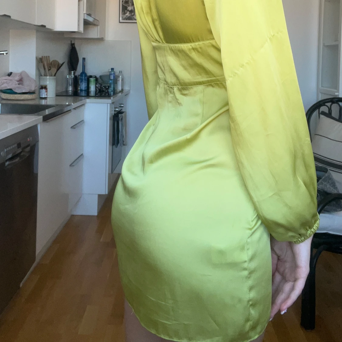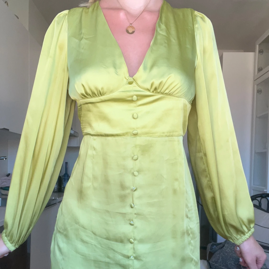 Superfin grön kort klänning i glansigt material med v-ringning och långa ärmar. Klänningen har markerad midja och dekorativa knappar framtill hela vägen ner. Perfekt för dig som vill sticka ut med en färgstark look. Storlek 40 men känns som en M