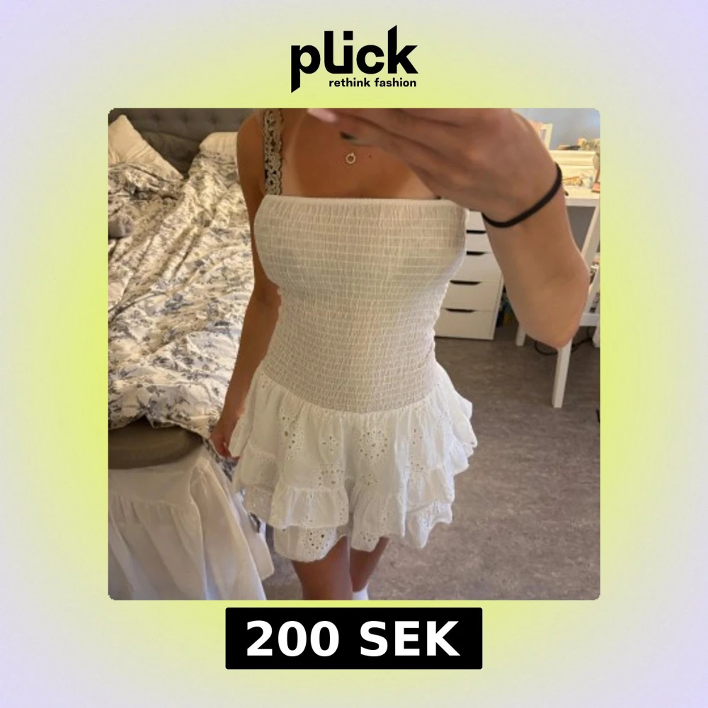 Supersöt vit kort klänning i st xs men funkar som s också, med smockad överdel och inbyggnad shorts . Kjolen har flera lager volanger och broderade hålmönster som ger en romantisk vibe. Perfekt för varma dagar och somriga tillfällen. Köpt för 400